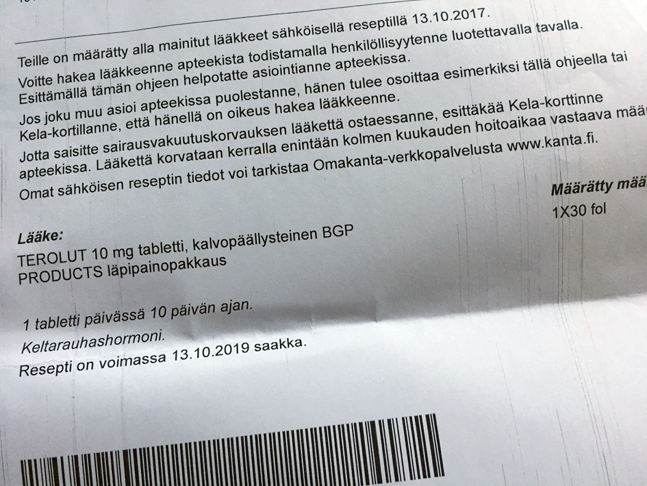 Jo ensimmäisen gynekäyntini yhteydessä syyskuussa olin saanut mukaani Terolut-reseptin. En kuitenkaan aloittanut hormonikuuria heti, sillä gynen mukaan piti odotella pari viikkoa paaston jälkeen, että josko menkat sittenkin alkaisivat. Eivät ne alkaneet, mutta hormonit eivät kiinnostaneet yhtään.