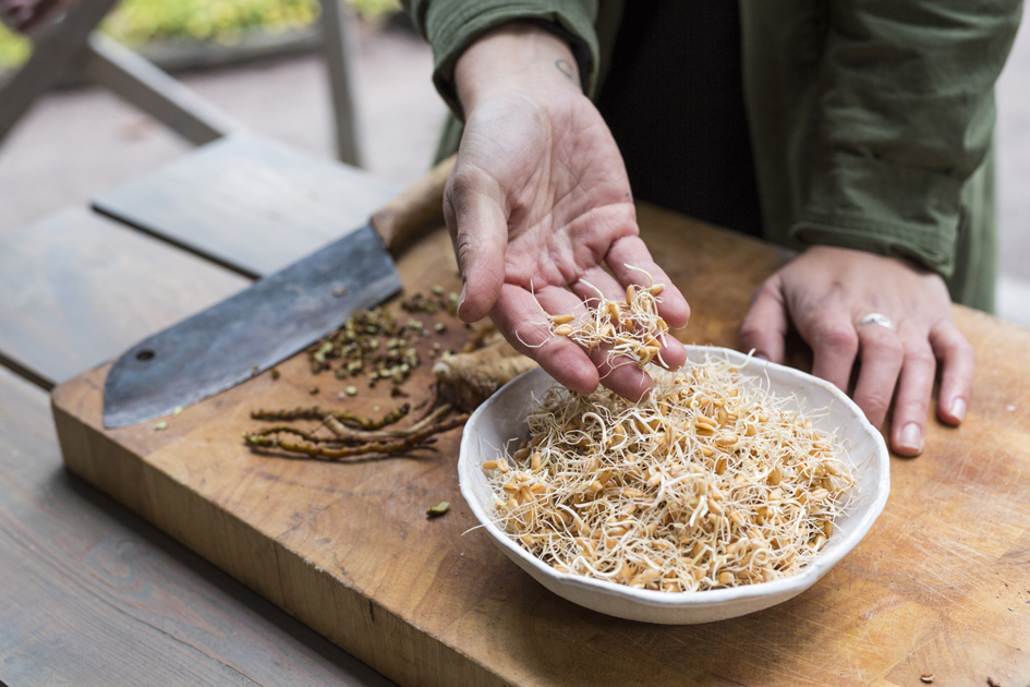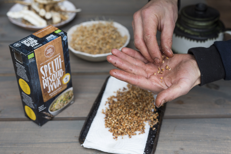 Liota jyviä yön yli. Kääri kosteaan kuituliinaan* ja nosta käärö siivilään. Tärkeintä on, ettei speltti pääse täysin kuivumaan, muttei myöskään makaa vetisessä rätissä. Pidä huoneenlämmössä. Huuhtele jyvät 1-2 kertaa päivässä ja aina huuhdottuasi siirrä ne takaisin kuituliinaan. Kolmessa päivässä idut ovat parhaimmillaan. Lähes kaikki jyvät itävät samalla periaatteella. Viljoihin syntyy idättämällä makeutta, mutta idätetyssä speltissä on lisäksi hieno lakritsainen maku!