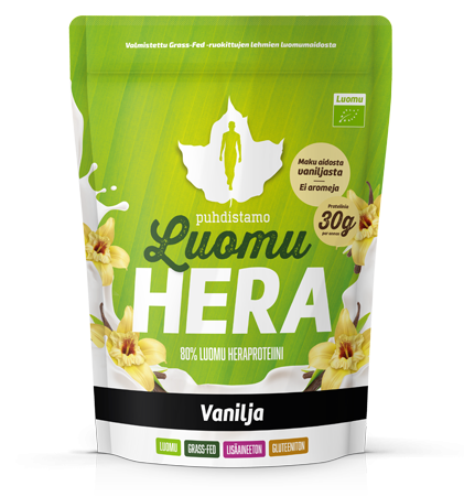 Kun näpyttelen Googleen ”kotimainen luomu hera”, ensimmäisenä ruutuun lävähtää Puhdistamon vaniljanmakuinen herajauhe. Pari klikkausta tutussa nettikaupassa ja pussi on matkalla. Paketin takana kerrotaan, että ”kaikki alkaa mahdollisimman laadukkaasta raaka-aineesta eli maidosta, joka saadaan vapaasti laiduntavista lehmistä. Talvisin lehmät ruokitaan luomurehulla.” Valmistusmaa: Suomi.