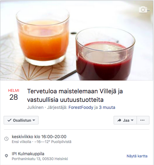 Klikkaa itsesi mukaan eventtiin täältä ja tuo mukaan perheesi/ystäväsikin. Eikö olisi upeaa saada kauppaan kotimainen ja vastuullinen villimehu? Niinpä!