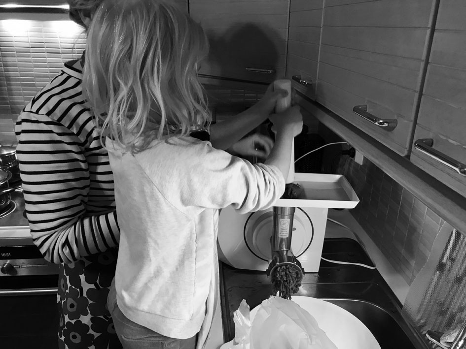 Metsästäjän lapsenlapsena 5-vuotias tyttäreni on nyppinyt hirvenlihasta karvoja ennen lihamyllyyn laittamista. Koen tärkeäksi opettaa lapsilleni, mistä liha on peräisin ja toisaalta, ettei se ole välttämättömyys, vaan pikemmin satunnainen lisuke. Ihmistä ei kenties ole tarkoitettu vegaaniksi, muttei missään nimessä syömään lihaa siinä määrin kuin nykyään tai tehotuotettua lihaa ylipäätään. Päivittäiselle lihansyönnille on vaikea keksiä muita perusteluja kuin makumieltymykset ja tottumus, mutta silti on utopistista ajatella, että puolet suomalaisista tai amerikkalaisista olisi vegaaneja vuoteen 2025 mennessä. Entä joka toinen syömämme ateria? Maapallon kannalta vaikutus on molemmissa sama. Itse pyrin syömään 80% vegaanisti ja nykypäivän vaihtoehdoilla kyse on pitkälti viitsimisestä ja vanhojen mielitekojen korvaamisesta uusilla.