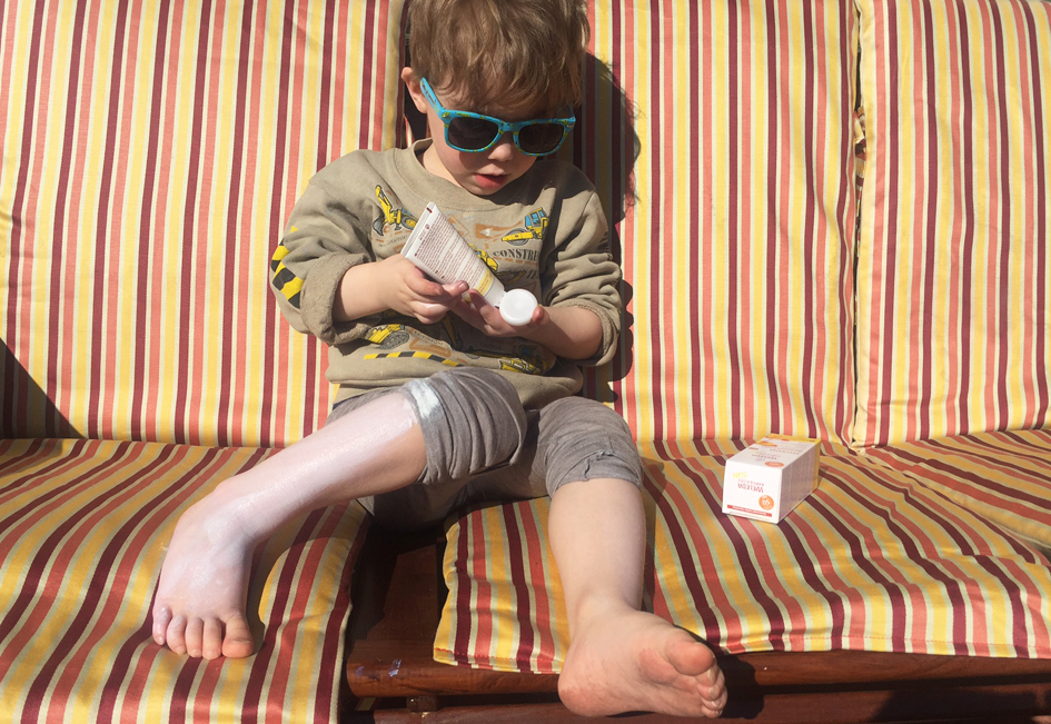 Weledan Edelweiss Sunscreen Lotion Sensitive -voide SPF 50 on tuubista tullessa paksua, valkoista voidetta. Hector levitti tuotetta vähän liian reilusti, mutta kannattaa muistaa, että aurinkovoidetta onkin oltava kunnolla, jotta suojaa on riittävästi! No minä tietenkin levitin voiteen hänelle paremmin, alapuolen kuvasta näkee havainnollisesti, minkä verran se näkyy iholla. Kyllä iho vaaleammaksi muuttuu, mutta lasten kohdalla haitta ei ole moinen. Aikuiset ymmärrettävästi eivät halua tällaisia vaalentavia aurinkotuotteita käyttää, mutta nämä testissä olleet lasten SPF30 ja SPF50 -tuotteet lienevätkin liian tuhteja useimmille aikuisille. Ainakin minusta tuntuu, etten itse koskaan käytä ihan näin isoja suojakertoimia.