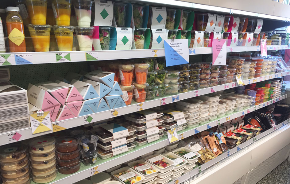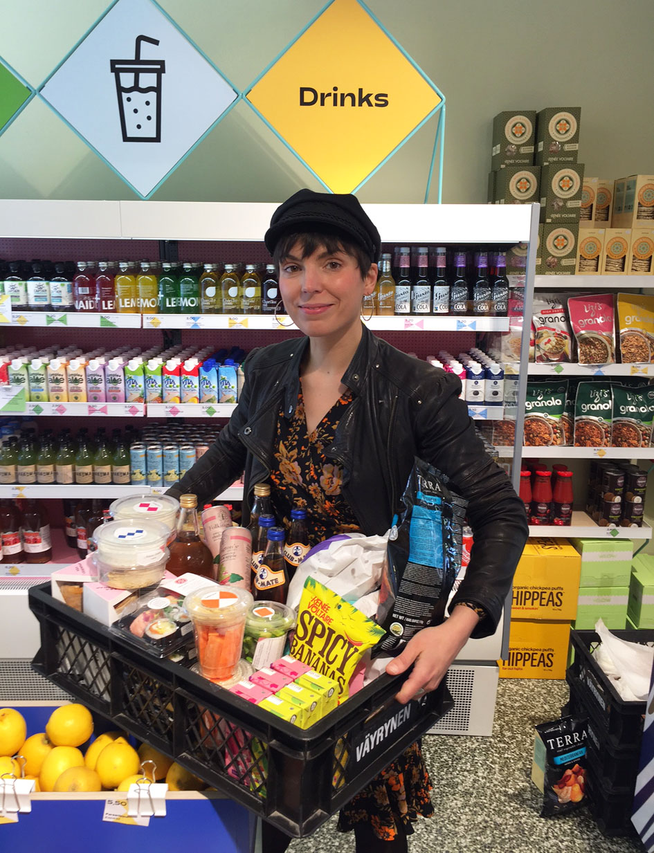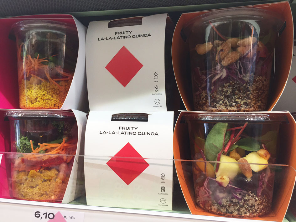 Parhaillaan Helsingin Lasipalatsissa toimivasta Kioskista paitsi perinteiset karkit, sipsit, limsat, kahvit, purkat ja jädet, myös ja ennen kaikkea salaatteja, lämmitettäviä ruoka-annoksia, piknik-koriin soveltuvaa naposteltavaa, tahnoja, wrappeja, brunssibokseja, sushia ja aamupuuroakin. Kioskin ideana on tarjota laadukasta ruokaa joko heti, kohta tai myöhemmin nautittavaksi. Ihan täydellinen konsepti esimerkiksi jos ei ehdi syödä aamupalaa tai tarvitsee nopean lounasruoan tai eväät piknikille. Kuva taitaa aika hyvin kuvastaa sitä, kuinka fiiliksissä olen paikan a) tarjonnasta b) siitä, että sain Kioskista testiin tuotteita, joilla keitrasin porukan koko vapuksi. Hashtag väsynyt ja onnellinen.
