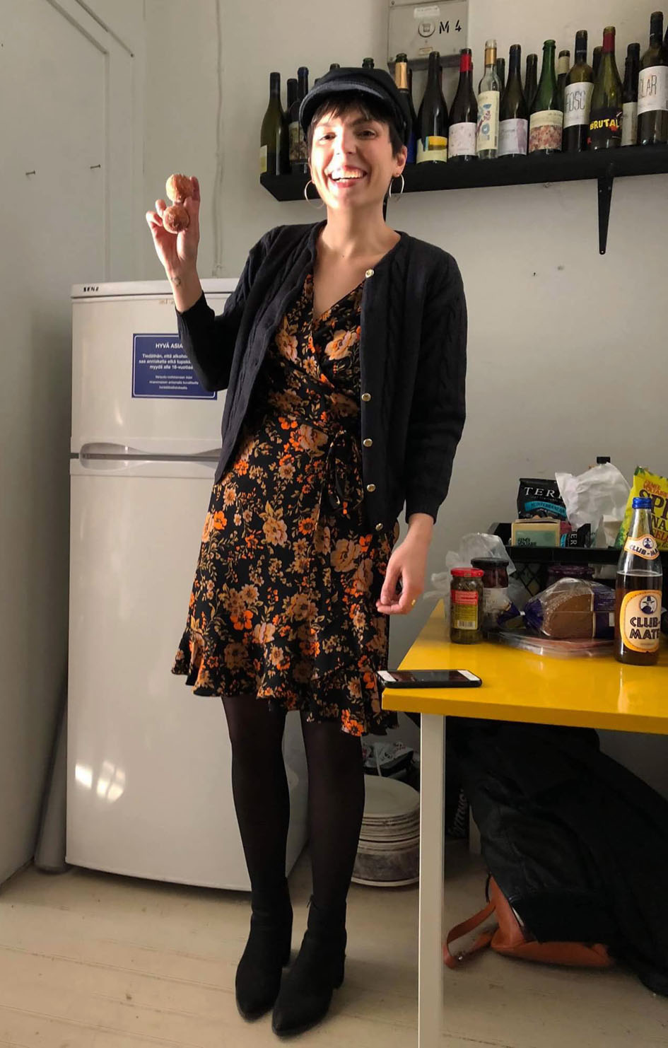 Kävimme hakemassa Vapun tarjottavat Kioskilta ja kurvasimme Fleminginkadulle auringonpaisteessa. Vappuaaton sää oli täydellinen ja sain tässä megastressin keskellä ihme kyllä relattua illan ilman, että koko ajan pohdin to do -listoja. Keskityin lähinnä epäilyttävän huumaaviin rahkamunkkeihin ja törkeän hyvään luomusimaan sekä sivusilmällä vahtaamaan ovea, ettei 3-vuotias lähde toikkaroimaan Kallion vappuhulinaan yksikseen.