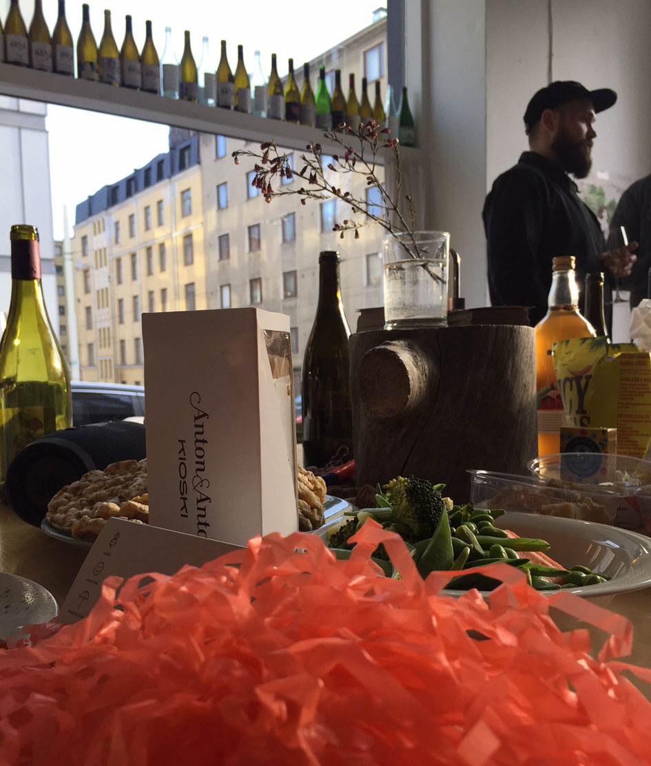 Anton & Antonilla on oma keittiö, jossa suurin osa ruoasta valmistetaan. Sen totta vie huomaa maussa! Mm. Olli Posti piipahti kemuissa ja kehui kovasti tahnoja (on aika tarkka syömisistään nimittäin) ja samaa kuulin muiden suusta. Kuinka helppoa ja maukasta: tuoreita vihanneksia ja dippejä. Just hyvää kioskikamaa! (Mikäli muuten pieniin pakkauksiin pakatut kasvikset, hedelmät, tahnat, jälkkärit ja ruoat ahdistavat muoviroskan näkökulmasta, mainittakoon, että kaikki on biohajoavaa muovia.) Erityismaininta myös Kioskin susheille; tosi freesiä ja maukasta. Ehkä paras vinkki on kuitenkin vegewrap: kätevästi kuljetettavaan, kolmion muotoiseen pahviboksiin pakattu wrap on ihanan mehevä ja maukas, olen nyt testannut sen kolmesti ja joka kerta ollut ihan sikahyvää. Iso suositus!