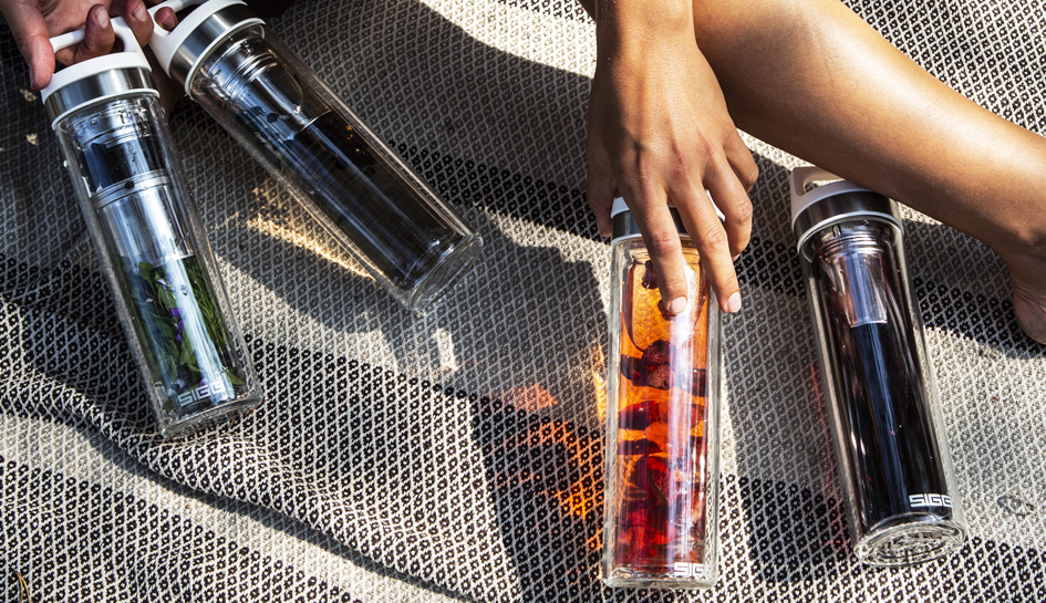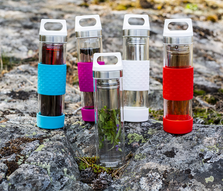 Olen tehnyt vastaavia juomia mihin tahansa kotoa löytyviin lasipurkkeihin. Teepussin kanssa helppoa ja siistiä, muulloin voi yleensä käyttää roippeisiin siivilää tai tarjoilla sopivasti muotoillusta kannusta. Retkillä toiminee tavallinen terästermos, joka monesta kodista löytynee valmiiksi. Toki jos on tarvetta uudelle mukana kuljetettavalle pullolle, niin miksipä ei SIGG olisi siihen yksi vaihtoehto.