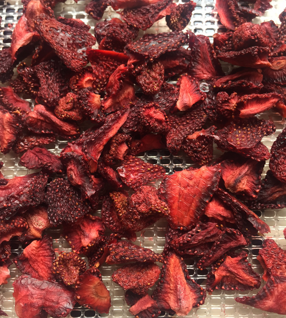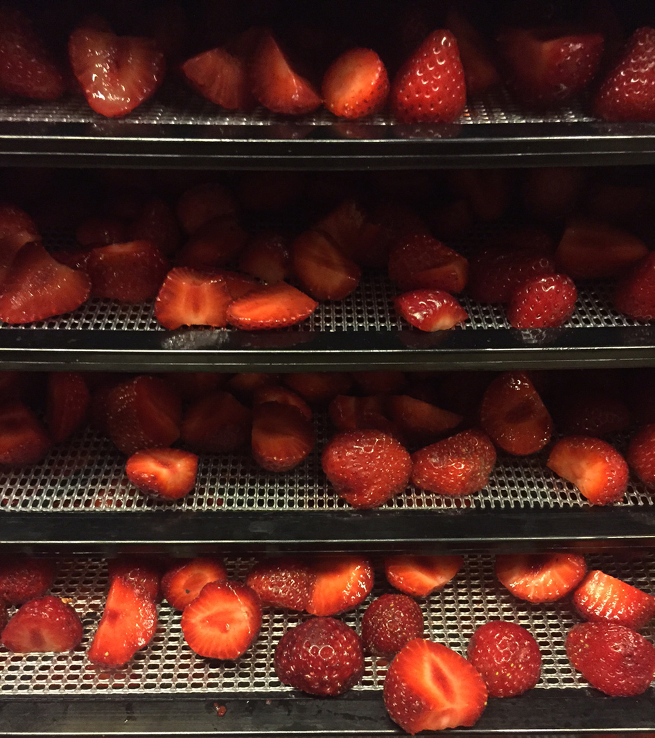 Eri raaka-aineilla on toki eri kuivumisajat. Esimerkiksi marjoissa menee helposti kauan, kun kuori estää kosteutta haihtumasta. Näillä kuvan mansikoilla kesti kuivua pari vuorokautta, koska olivat niin meheviä ja kosteita. Saimme Ossin kanssa ison satsin hävikkimansikkaa, ja kuivattaminen oli ehdottomasti fiksuin tapa säilöä saalis.
