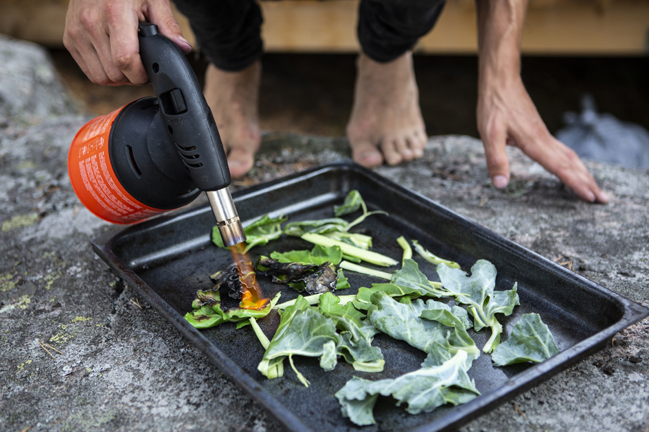 Grillaa, paahda uunissa tai kaasupolttimella merikaali kauttaaltaan tummanruskeaksi / mustaksi. Hiero lehdet siivilän läpi jauheeksi. Lisää aavistus suolaa. (Minusta lopputulos näytti lähinnä karsinogeeneille, mutta on ihan hullua, kuinka musta jauhe maistuu aivan merikaalille, eikä kärventyneeltä ollenkaan!)