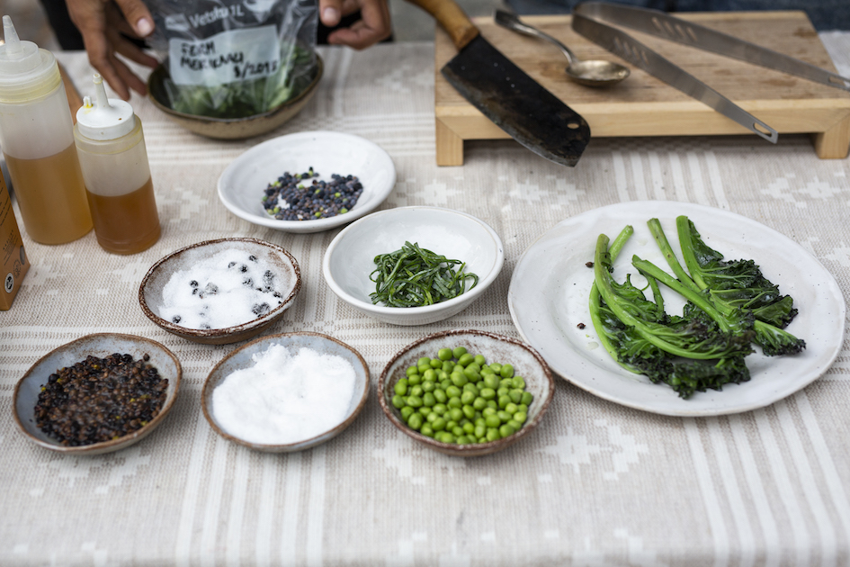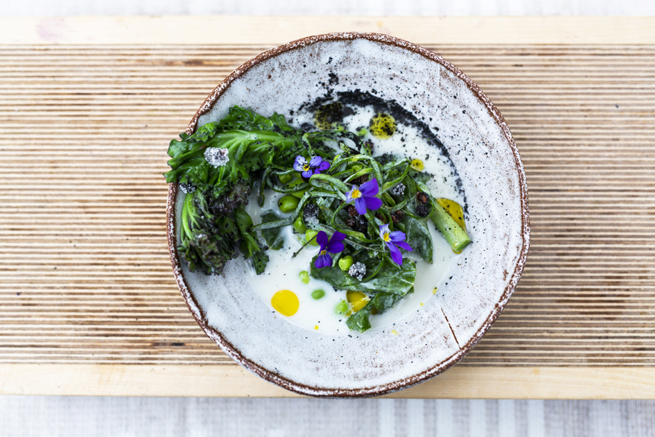 Merikaali-kesäkeittoon tulee siis liemen lisäksi kevyesti keitettyä merikaalia, fermentoitua merikaalia, merikaalituhkaa, herneitä, katajanmarjoja ja keto-orvokkeja. Kasaa annos kuten haluat, tässä Ossin taidonnäyte.