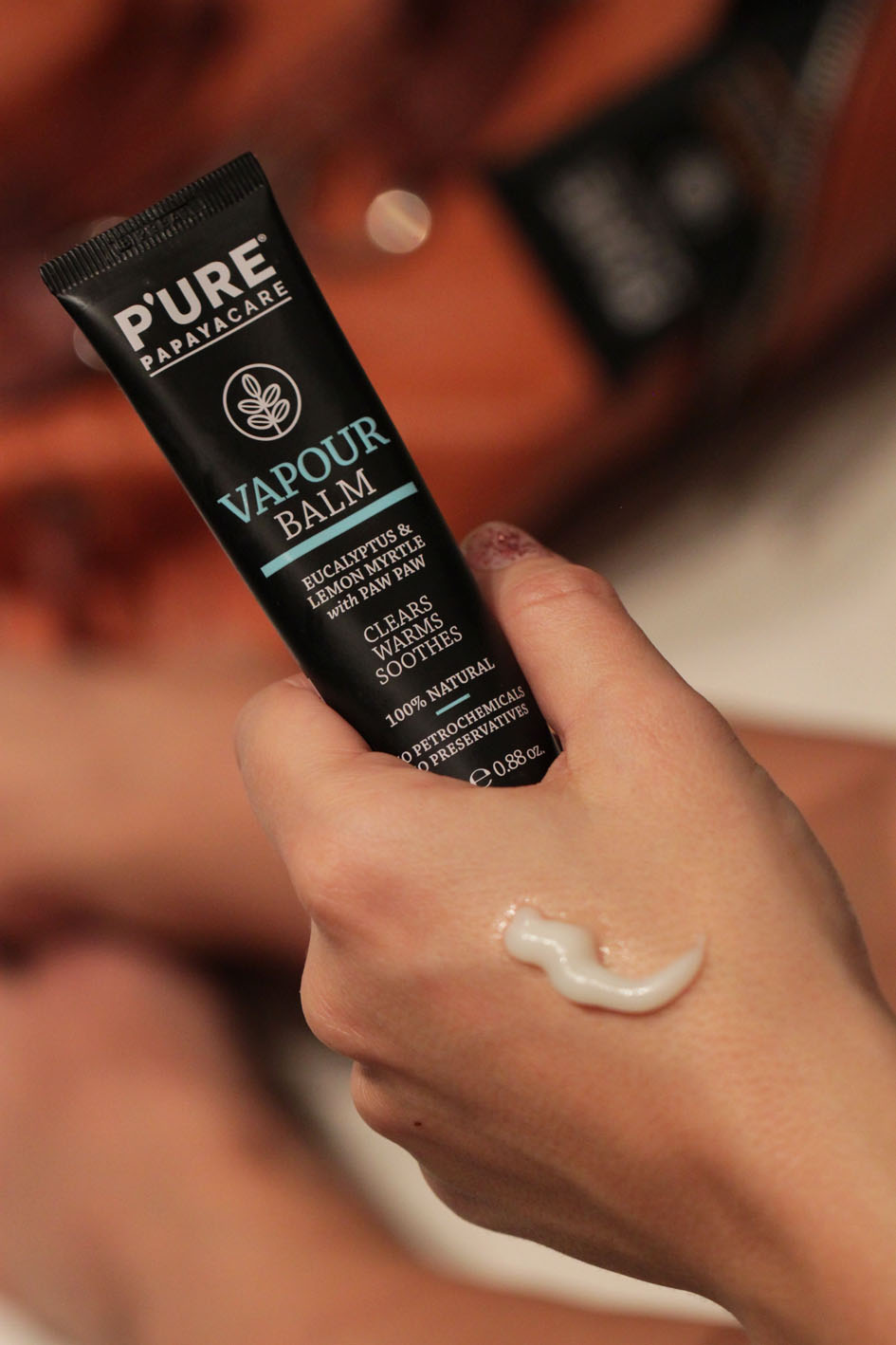 Vapour tuoksuu huumaavasti eukalyptukselle ja rauhoittaa olon välittömästi, kun sitä levittää iholle. Vähän se tuntuu lämmittävänkin ihoa, vaikka ei kuitenkaan yhtä vahvasti kuin perinteinen Tiikeribalsami ja vastaavat. Ei ole siis niin vahva, etteikö voisi käyttää lapsille. Tuote on vedetön ja todella tehokas kosteuttaja. Pikkuversio on mukanani jatkuvasti.