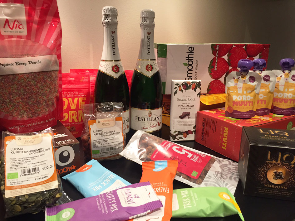 Tutustuin palveluun tilaamalla satsin sellaista, mikä sopii oman perheen ruokavalioon. Yhtään en osannut odottaa, mitä nettikaupasta löytyisi. Toisaalta toivoin, ettei luomuelintarvikkeita olisi päätyisi hävikkiin, mutta toisaalta taas halusin ostaa juuri niitä ja ilahduin, kun luomutuotteita löytyi. Ristiriitaista! Klikkasin kyytiin mm. taatelipatukoita, smoothieita, luomu-nonparelleja, pähkinä-snäkkejä, lakua ja pari pulloa alkoholitonta kuohuvaakin. Valikoimissa on myös hygieniatuotteita ja esimerkiksi vegaani- ja gluteenittomat tuotteet ovat omissa tuoteryhmissään. Kätsyä!