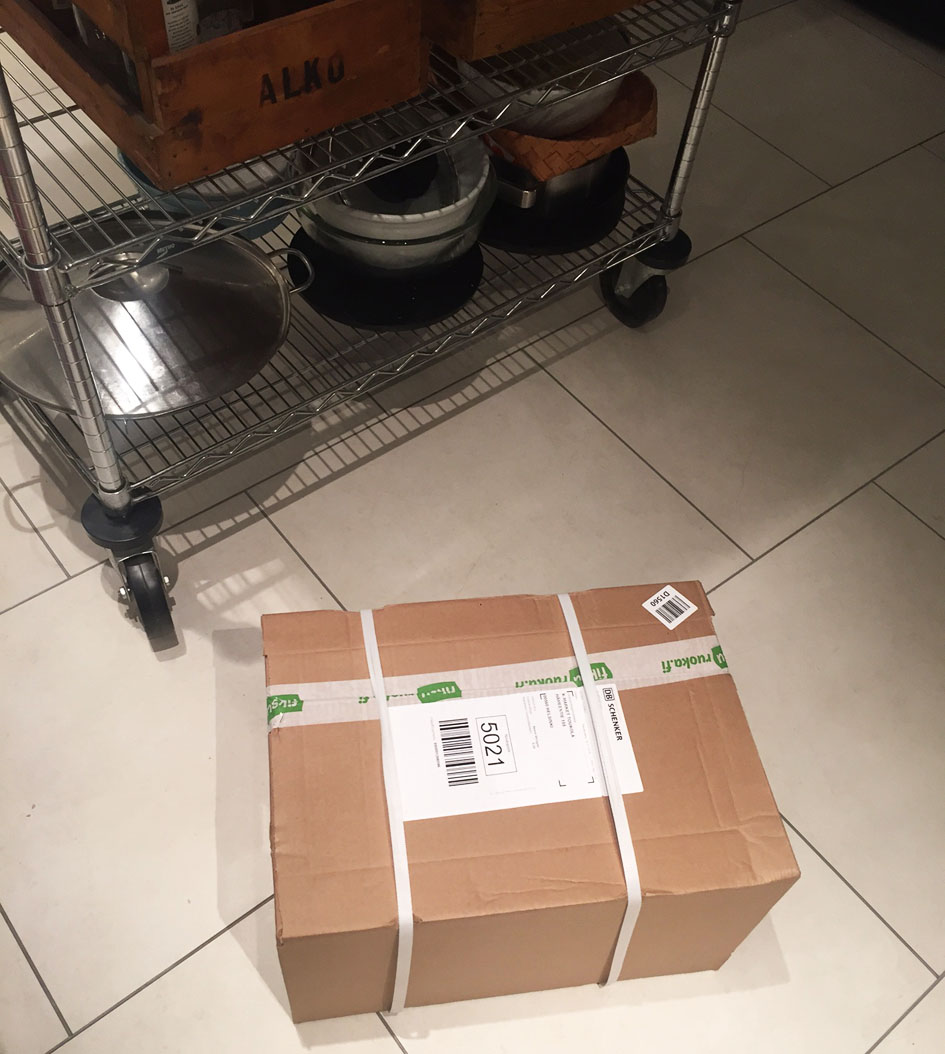 Tein tilauksen perjantaina ja kahdessa päivässä paketti odotti lähikaupassani; hain ruoat sieltä, mistä ostan ne normaalistikin. Se mikä itseä mietitytti, oli paketin paino: jaksanko kantaa satsin, tarvitsenko apukädet, vai jopa auton? Toki tiesin, mitä oli tullut tilattua, mutta oli vaikea kuvitella satsin yhteispainoa. Tilausvahvistuksessa painoa ei mainittu missään, ei myöskään saapuneessa tekstari-ilmoituksessa. Paketti oli aika raskas ja sain sen kyllä yksin kotiin, mutta tämän tiedon olisin halunnut voida tarkistaa jostakin.
