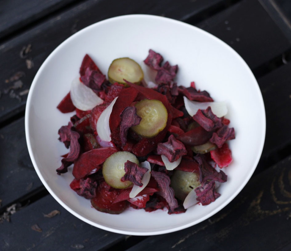 Ah tästä tuli niin hyvää! On nautinnollista kokea suussa monia eri suutuntumia, ja sitä tässä satsissa totta vie on: pehmeyttä, rapeutta, sitkoa ja puruvastusta… Plus bonuksena punajuuren upea väri. Kaiken kukkuraksi halpa ja ilmastofiksu vaihtoehto.