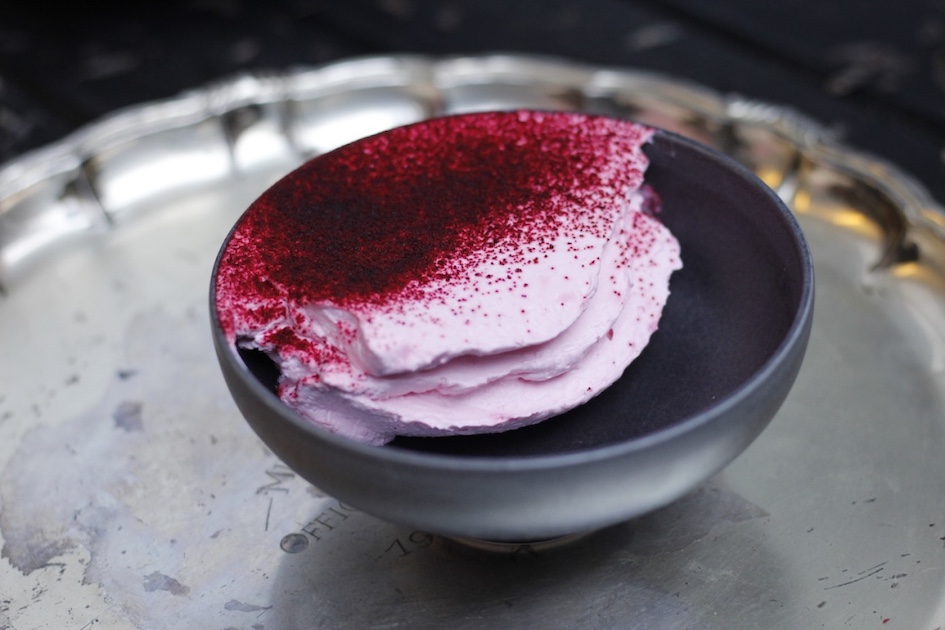 Vatkaa kaikki raaka-aineet keskenään vaahdoksi, sauvasekoittimella onnistuu hyvin. Tulos on niin jämäkkää, että sen voi muotoilla tarjoiluastiaan vaikka näin upeasti. Koputtele päälle punajuurijauhoa teesihvilän läpi.
