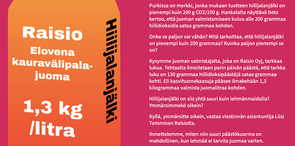 Ruotsalaista Oatlya on kyllä haastateltu, ja sieltä onkin saatu tarkat tiedot, jonka mukaan kaurajuomalitra tuottaa viidenneksen niistä CO2-päästöistä, mitä lehmänmaitolitra, mutta suomalaisia vastaavia lukuja ei ole juttuun kaivettu. Toimittaja toteaa, että Valio ja Juustoportti eivät ole päästöjään laskeneet, eikä lukuja siksi saatu artikkeliin, mutta eihän kaurajuomien tuottajakenttä nyt näin suppea ole! On esimerkiksi Pirkkaa, Plantia ja Kaslinkia — joista ainkin viimeksi mainittu omaa luvut siitä, kuinka paljon Suomessa, suomalaisesta kaurasta tuotettu kaurajuoma kuormittaa ilmakehää. Tieto löytyy ihan julkisesti täältä.