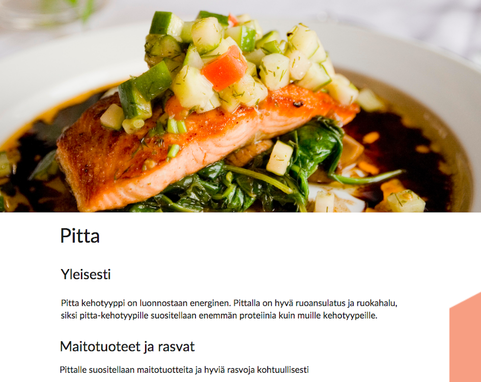 Opin jo, että taidan olla kehotyypiltäni eniten pitta, eli ”päättäväinen”. Tai oikeastaan taiteellisen vatan ja päättäväisen pittan yhdistelmä. Kehotyyppejä on 7 ja Re-Startissa on mm. testi, jolla voi saada suuntaa oman kehotyypin tunnistamisessa. Sen myötä voi alkaa viilata ruokavaliotaan itselleen sopivaan suuntaan, johon osio 4. antaa eväät.