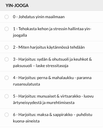 Tässä kuvakaappaus valmennuksesta: oikealla näkyvät vihreänä suoritetut osiot, punaisella käynnissä oleva ja valkoisina suorittamattomat. Näitä on aikaa käydä läpi 6 kk ajan ostohetkestä.
