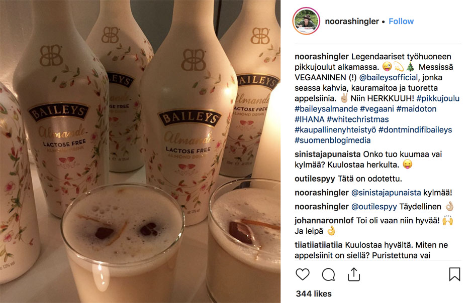Olin hamstrannut juhlia varten ison määrän glögiä, mutta sunnuntaina tajusin niiden jääneen korkkaamatta, kun teimme niin herkullisia drinkkejä. Olin saanut juhliin testiin Baileysnin vegaaniversiota, josta valmistimme juomia vieraille.
