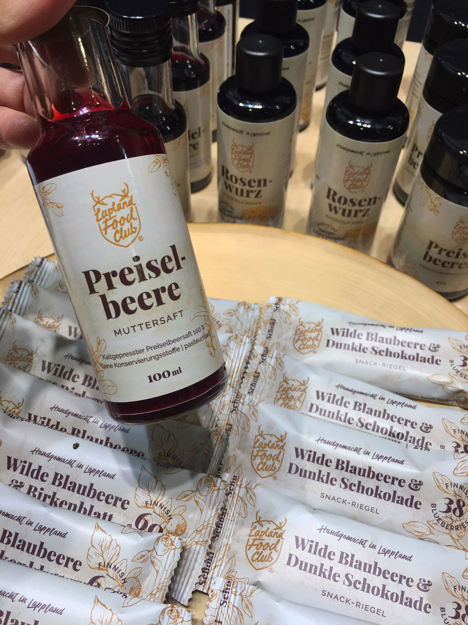Kotimaiset marjat ovat fokuksessa Lapland Food Clubin tuotteissa ja marjoja löytyi messuilta toki muiltakin. Oli hilloja, marmeladia, mehua jne. Se mikä kuitenkin koitunee joidenkin yrittäjien haasteeksi, on liika kotikutoisuus. Täällä Suomessa tuote saattaa käydä kaupaksi sympaattisuudella, mutta kansainvälisillä areenoilla pitäisi näyttää ammattimaiselta. Jos ja kun vahvuutena on paikallisuus ja pienyrittäjyys, pitäisi tuotteen logo, etiketti ja ilme kuitenkin olla ison maailman meininkiä. Lisäksi yrittäjillä pitäisi ehdottomasti olla vähintään ajantasaiset nettisivut, joista kiinnostuneet löytävät infoa. Edes tätä ei löydy kaikilta Grüne Woche -messuille osallistuneilta suomalaisyrityksiltä. On aika älytöntä maksaa paikasta messuilla ja jakaa tuhansia ilmaisia tuotteita yleisölle, joka ei sitten messujen jälkeen löydä mieleen jäänyttä tuotetta mistään.