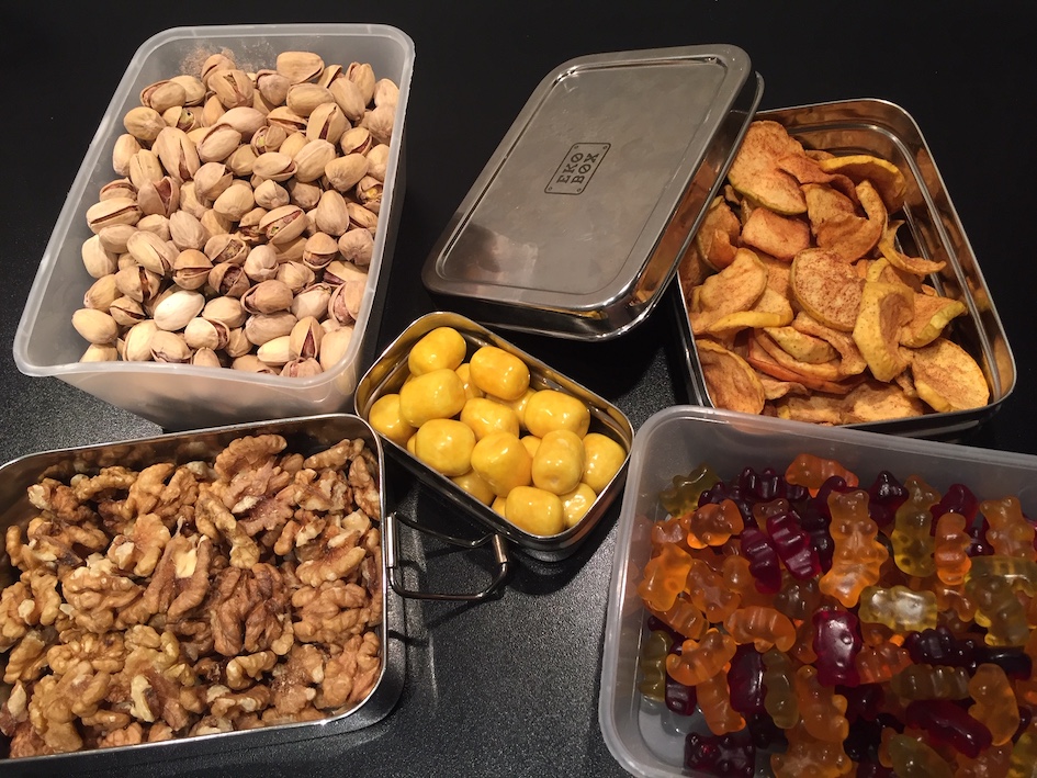 Itse kävin hamstraamassa pähkinöitä ja kuivattuja hedelmiä, joita meillä kuluu paljon. Tällä kertaa ostin myös skidien lemppareita: vegaanisia nallekarkkeja.