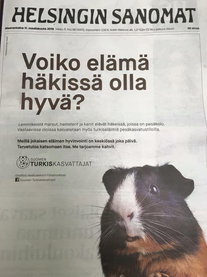 Viimeisen viikon aikana Helsingin Sanomien kannessa olleita, Suomen turkiskasvattajien mainoksia on puitu niin somessa kuin perinteisessäkin mediassa. Lemmikkimarsun olojen vertaaminen turkiseläimen häkkielämään sai monilla kahvit väärään kurkkuun ja omassa FB-feedissä usea ilmoitti lopettavansa Hesarin tilaamisen.