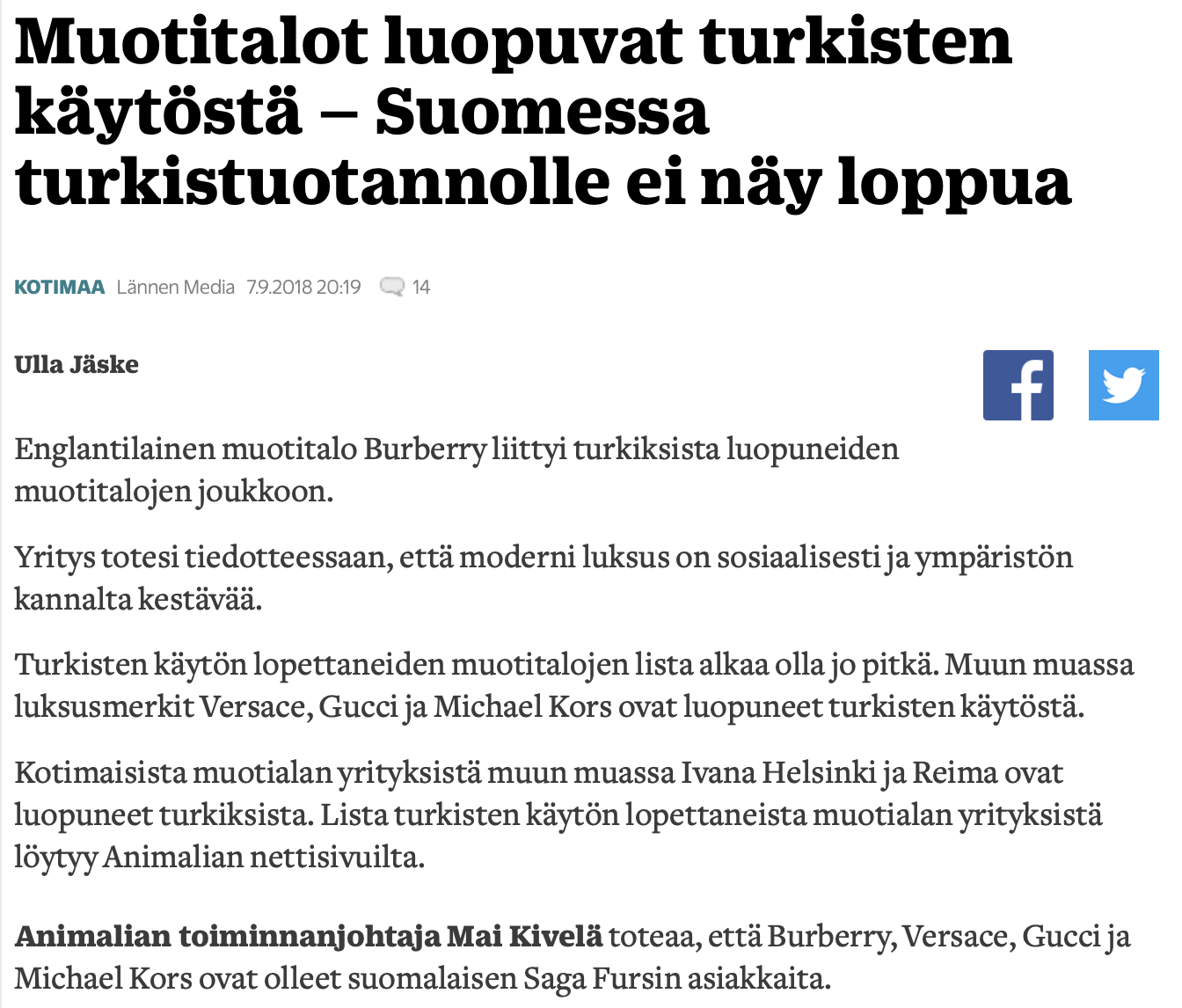 Entäpä sitten itse ilmoittaja, mitä voimme päätellä Suomen Turkiskasvattajien ilmoituksesta? Turkisalan imago ei ole hohdokas ja viime viikon aikana Hesarin kannessa julkaistu, kolmen ilmoituksen sarja, on jonkinlainen viimeinen hätähuuto. Näin itse sen tulkitsen. Muotialalla moni talo on lupunut turkiksista, ja yhä harvempi kuluttaja pitää turkisalaa tarpeellisena. (Kuvakaappaus: ts.fi)