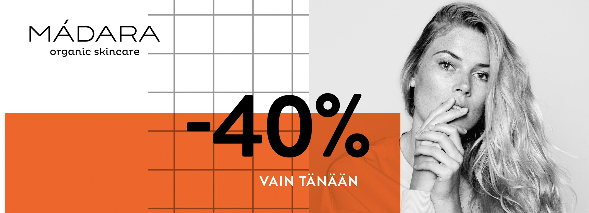 Hoi ystävät: tänään on taas luonnonkosmetiikan ystävän juhlapäivä! Mádaralla on meneillään -40% ale, eikä pelkästään brändin verkkokaupassa, vaan myös esimerkiksi Stockmannilla ja Ruohonjuuressa. -40% ale on voimassa vain tänään, joten jos haluat toimia, tee se ennen nukkumaanmenoa!