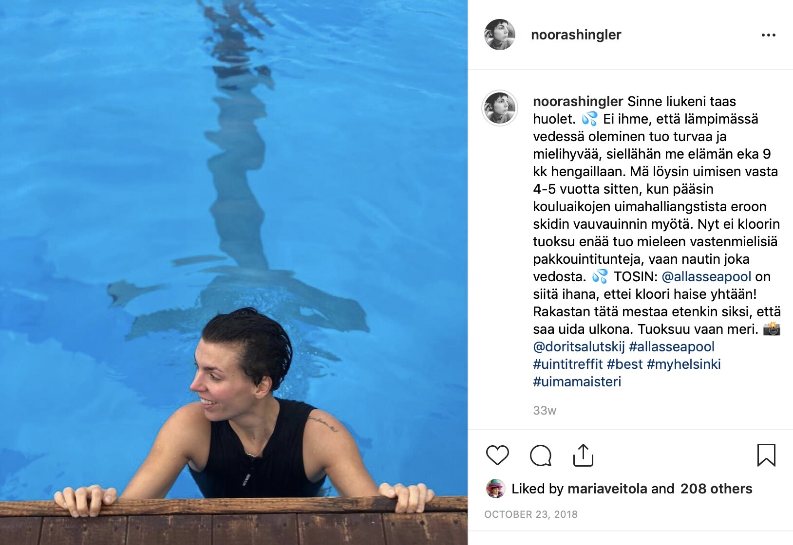 Jo silloin kun Allas avasi, löysin uimiseen ihan uuden levelin, kun sain harrastaa lempilajiani ulkoilmassa. En varsinaisesti uimahalleista, siitä kloorinhajusta. Ja aina on se ikävä fiilis, kun pulahdat altaaseen ja vesi tuntuu kylmältä. Tottuuhan siihen tietenkin, mutta uimahalliin verrattuna fiilis Altaalla on ihan eri: pulahdat viileästä ilmasta lämpimään veteen. Ihan paras tunne maailmassa!