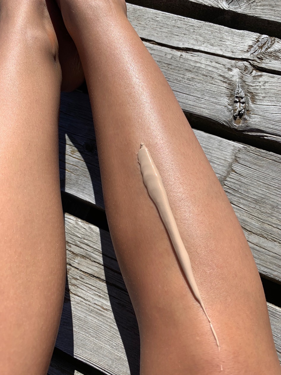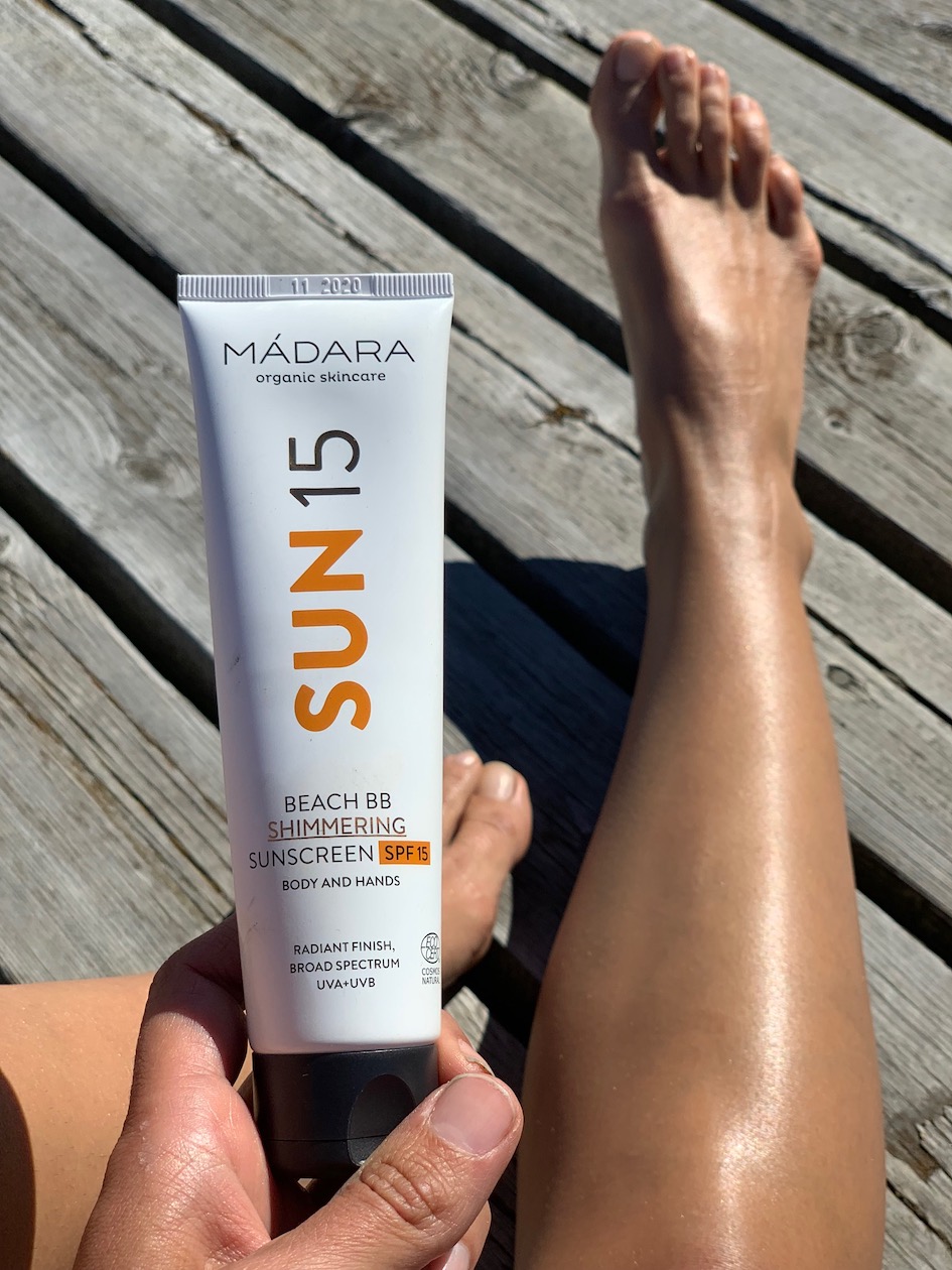 Toinen suosikkini on alapuolen kuvassa näkyvä, kevyesti sävytetty SUN 15 BB Shimmering Sunscreen. Se antaa iholle vähän sävyä ja kauniin kimalteen, jollaista en ole havainnut yhdelläkään toisella luonnonkosmetiikkamerkillä. En tiedä havaitseeko kimallusta alapuolen kuvasta, mutta paljaalla silmällä sen erottaa hyvin. Olen vähän koukussa tähän tuotteeseen — instant sexy legs!