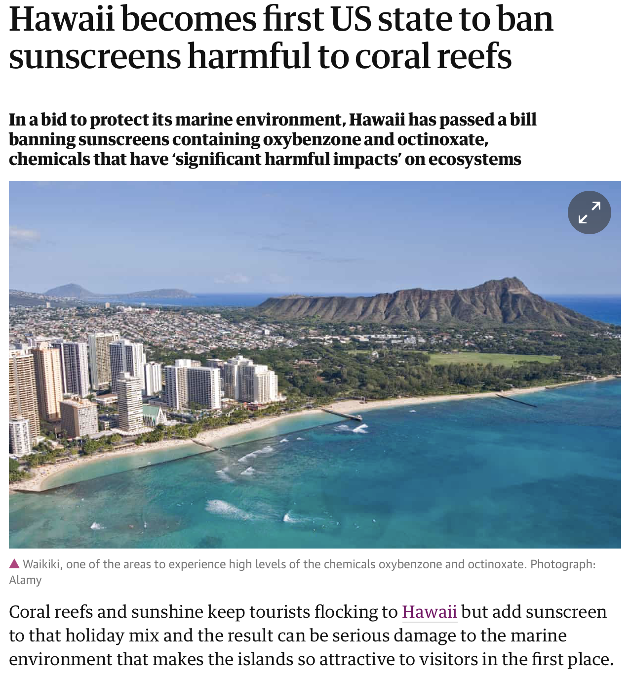 Kosmetiikan osalta kuitenkin voimme tehdä paljonkin, sillä tällä kentällä vaihtoehtoja on. Sekä kuluttajatasolla että kansallisesti voidaan säästää meriä ja esimerkiksi Havaiji on tästä hyvä esimerkki: osavaltio kielsi ensimmäisenä Yhdysvalloissa koralliriuttoja vaurioittavat kemikaalit aurinkovoiteissa. Suurinta huolta aiheuttaa kemikaali oksibentsoni ja myös oktyylimetoksisinnamaatin on havaittu haalistavan korallien värejä. Näitä aineita sisältäviä tuotteita ei saa myydä Havaijilla vuodesta 2021 alkaen. Kyseessä on Ylen jutun mukaan 3500 suosituinta aurinkotuotetta.