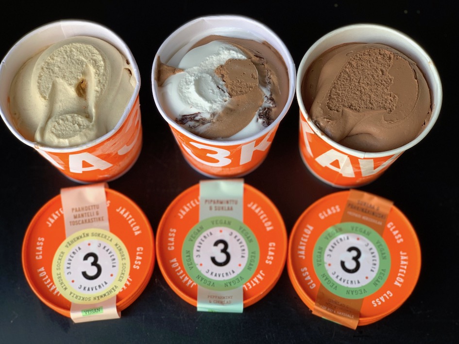 Muutos on tapahtunut nopeasti: 4-5 vuotta sitten ei olisi voinut mennä kauppaan kärsimään vegaanijäätelörunsaudenpulasta. Siistiä on se, että nyt voi herkutella jopa kotimaisilla vegaanijäätelöillä, jotka itse asiassa ovat markkinoiden parhaimmistoa. Kolmen kaverin jäätelö ylsi viime vuoden Vegemessujen VegeAwardseissa tuplavoittoon pokaten sekä parhaan jäätelön että parhaan brändin tittelin.
