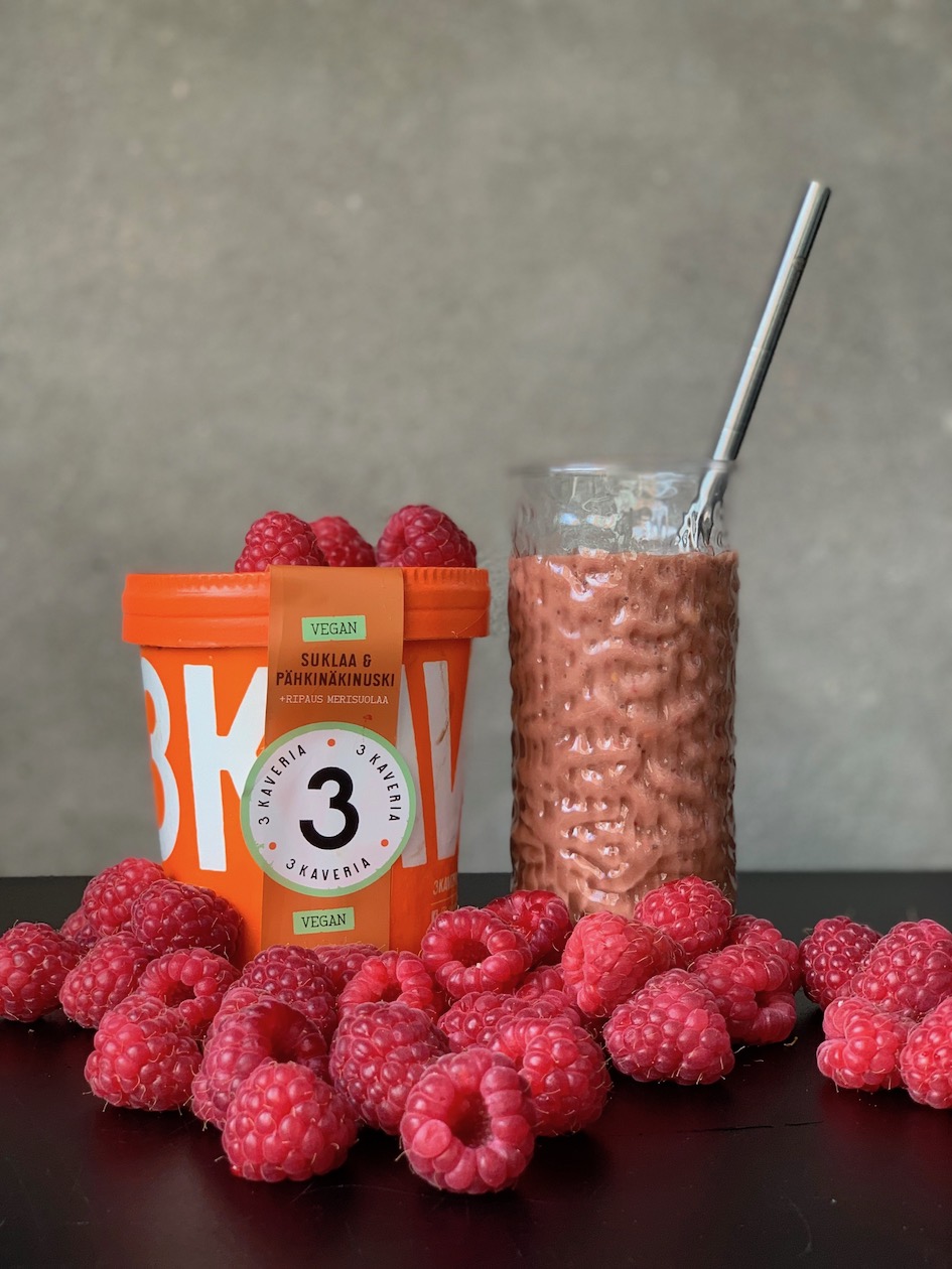 Kolmen kaverin suklaa & pähkinäkinuski — se Vegemessuilla palkittu — on niin hyvä, että kulhoon annostellessa en lisännyt kuin tuoreita vadelmia seuraksi. Mutta ne kyllä passaavat aivan täydellisesti kyseisen jäätelön kanssa ja tekevät annoksesta ihanan freesin. Suosittelen kuitenkin testaamaan kyseistä jäätelöä myös pirtelön muodossa. Heitäpä sekaan kasvimaidon sijaan jääteetä sekä ne vadelmat ja saat aika huikean kesädrinkin!