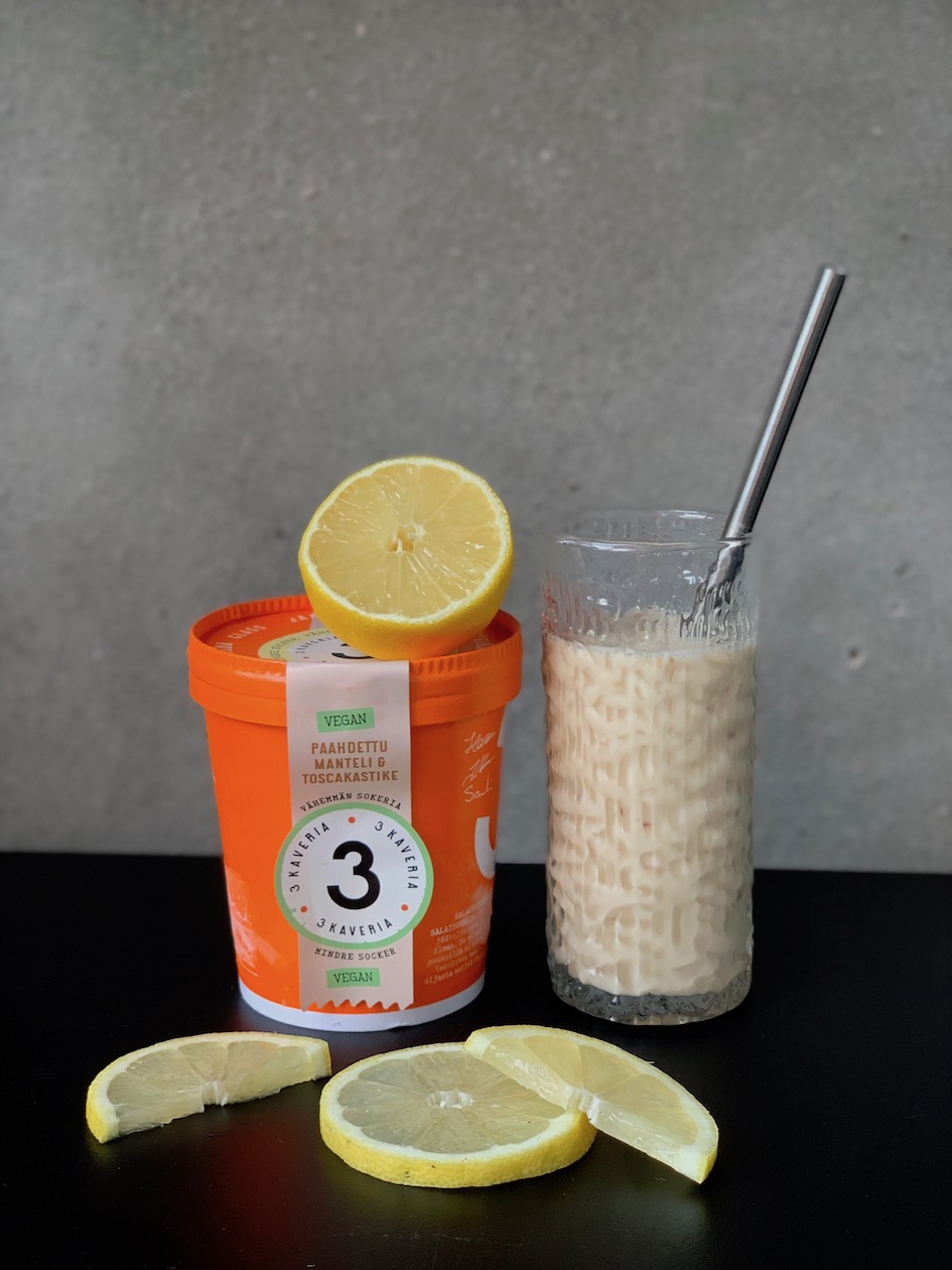 - 4 dl Kolmen kaverin paahdettu manteli & tosca -vegaanijäätelöä