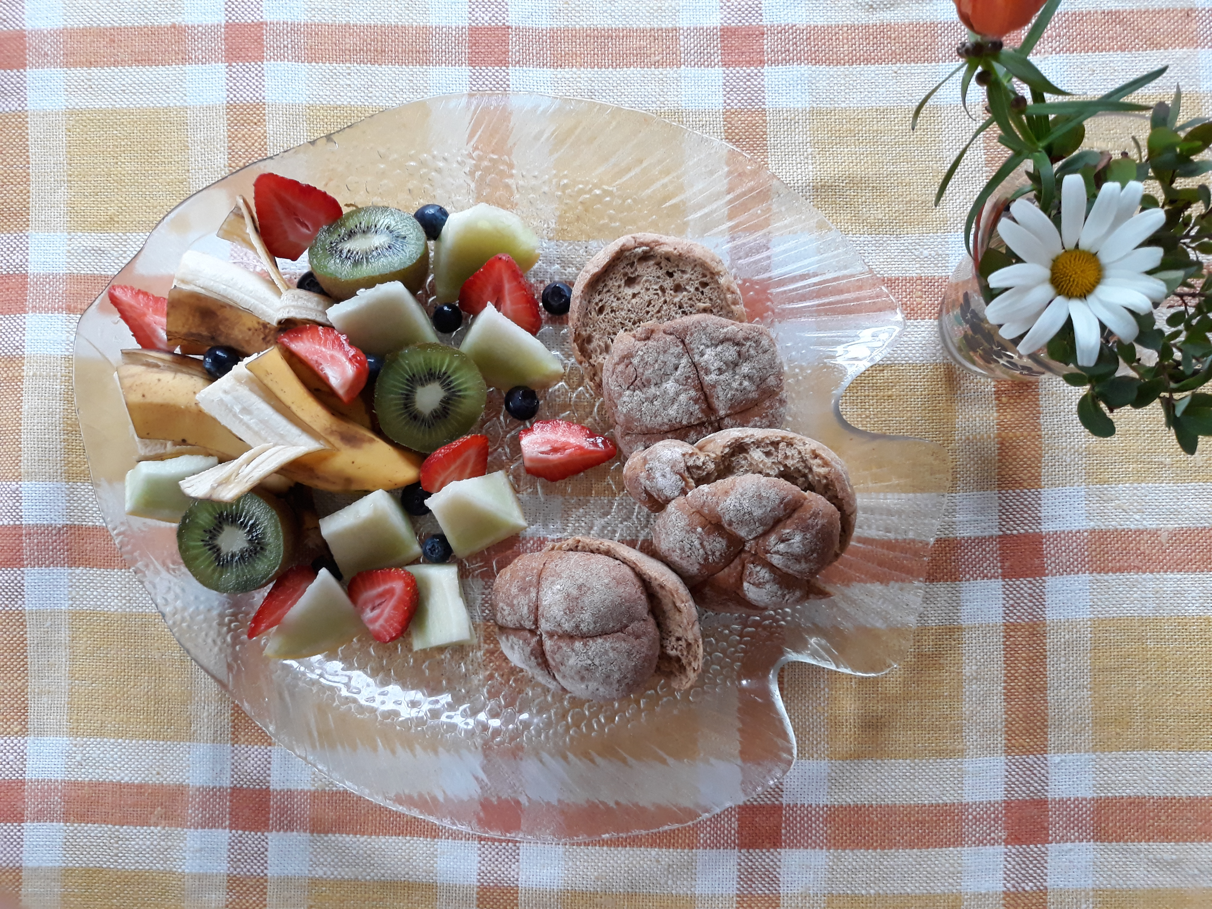 Jätteettömin leivänpäällinen on ehdottomasti vihannekset (oletko kokeillut porkkanasuikaleita?), mutta mukana oli myös juustoa, jota lähikaupassamme myydään tuoretiskin jämäpaloina tuorekelmuun käärittynä. Aamuun kuuluvat tietenkin myös hedelmät: 10 omenaa, muutama meloni ja kiivejä. Ja tietysti pannukahvi!