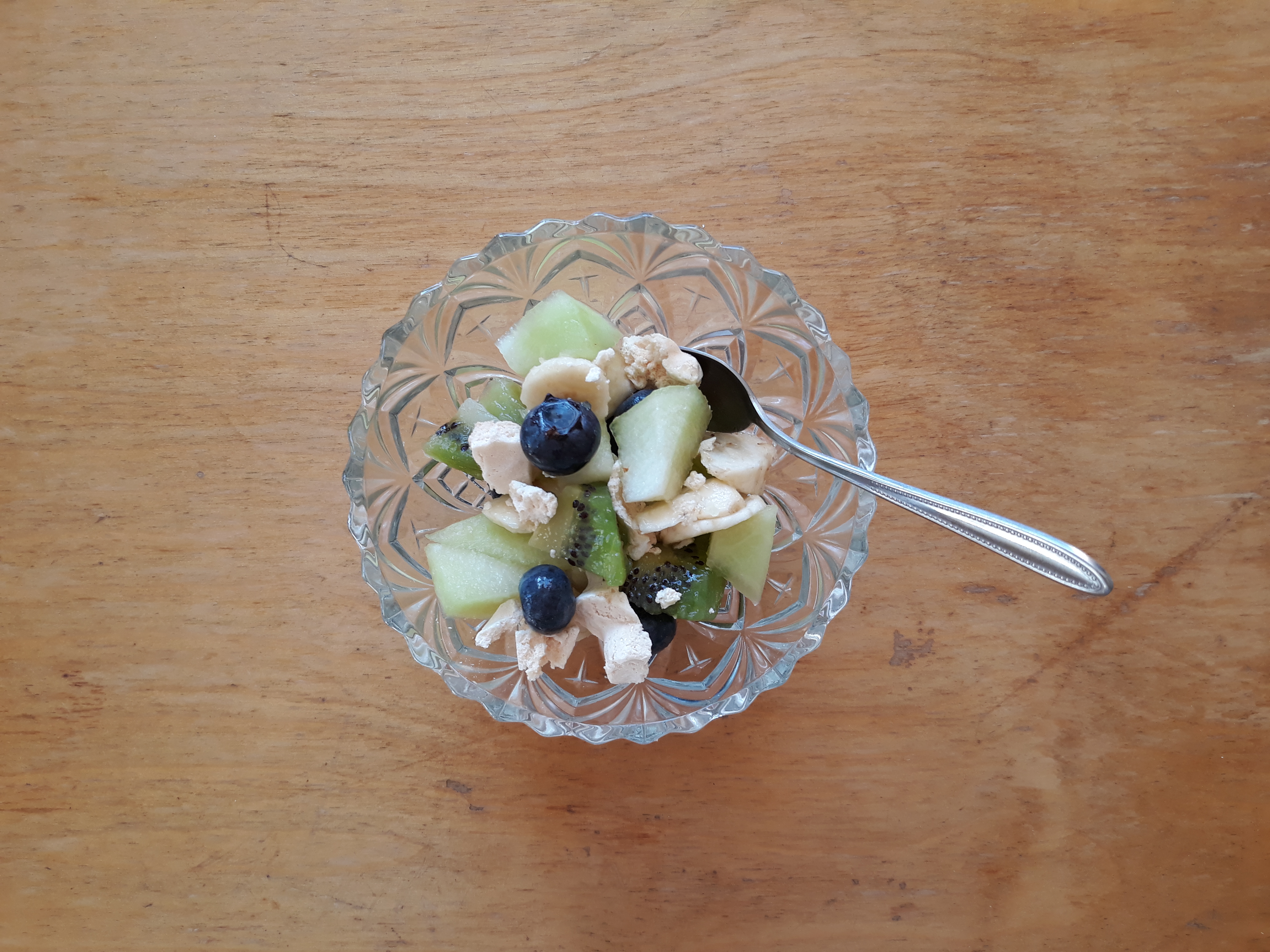 Ihan paras jätteetön välipala on hedelmäsalaatti. Extrana pakkasin mukaan marenkeja, jotka säilyvät huoneenlämmössä pitkään ja myydään kartonkipakkauksessa. Muutaman marengin muruilla saa tuunattua hedelmäsaalaatista ihanan jälkkäriversion! Saaressa myös pala suklaata maistuu ihan taivaalliselta, kun yhden levyn on riitettävä pitkään.