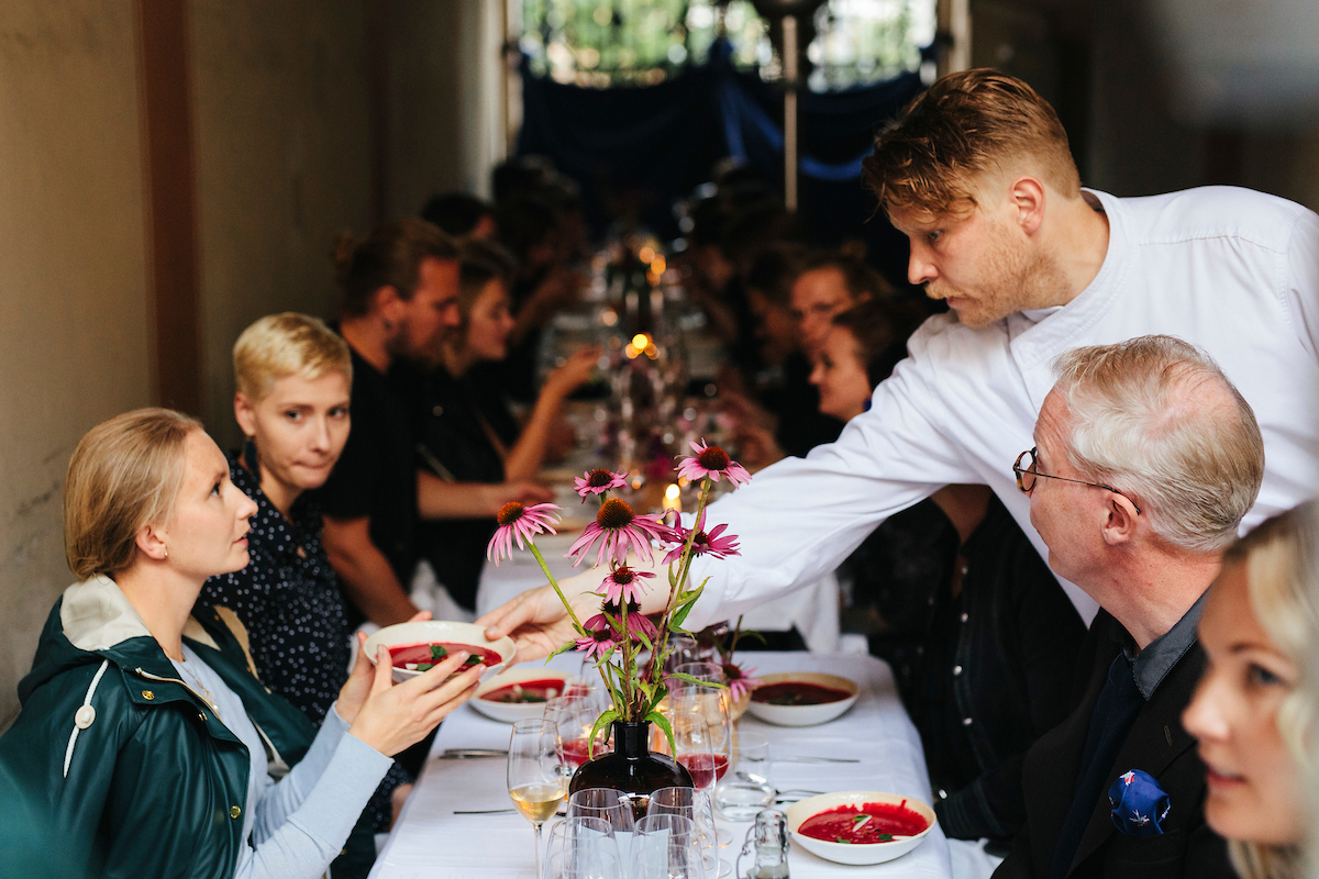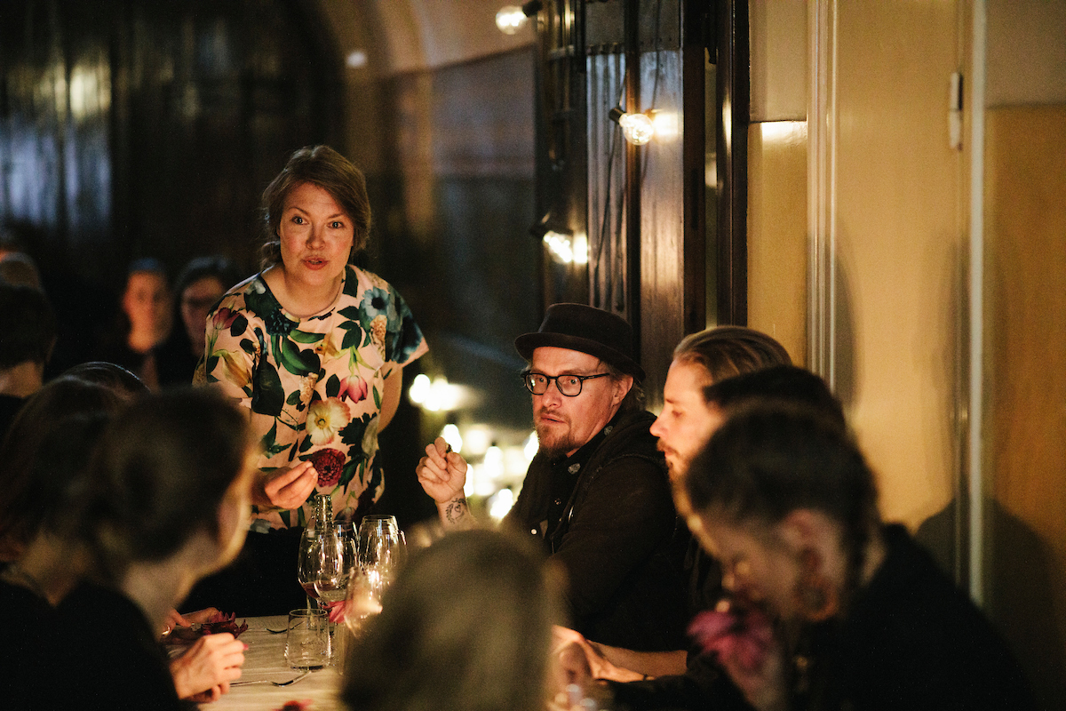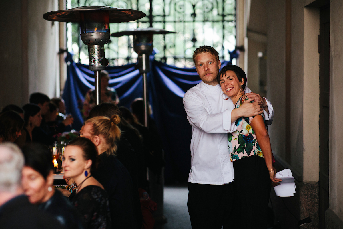 Frantsilan Anna on ihan samasta puusta: mikään ei ole mahdotonta — teoriassa ainakaan! Me kolme innostutaan ihan yhtä paljon ja sitten mun (ja Alman) nakki on hoitaa tuotannollinen säätö. Täytyy sanoa, että seuraavalla dinnerillä olisi kiva, jos meillä olisi oikea keittiö, juokseva vesi ja sähköä. Rakensimme nyt ravintolan vanhaan toimistotilaan, eli vuokrasimme koko keittiökaluston helloista pakastimiin ja juomakaapeista keittolevyihin. Sähköä vedettiin pitkiä matkoja ja ekassa kattauksessa tosiaan poksahti sulake ja hätiin tarvittiin pari ravintolaa lähikortteleista, jotta saatiin ruoat lämpimäksi. Onneksi kollegat jeesivät. (Kiitos ravintola Söder ja YesYesYes!) Kun sulakehommat saatiin haltuun, sujui loppuilta kevyen tuntuisesti.