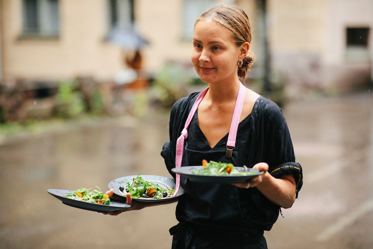 Asiakkaita oli 120, kattauksia kaksi. Aikaisemman kattauksen vieraat ruokailivat päivänvalossa, myöhäisempi illallinen alkoi hämärän laskeuduttua. Tunnelma oli mieletön, ja vaikka riskit ulkona syömisessä olivat toki isot — puolet vieraistamme kun ruokaili porttikongissa — meni kaikki hyvin. Lämmittimet toimivat moitteettomasti ja viluisille oli vilttejä. Henkilökunnalle ei ehtinyt sen sijaan tulla kylmä, hommia painettiin uutterasti yhteen saakka yöllä — kiitos koko mielettömälle keittiö- ja salitiimille!