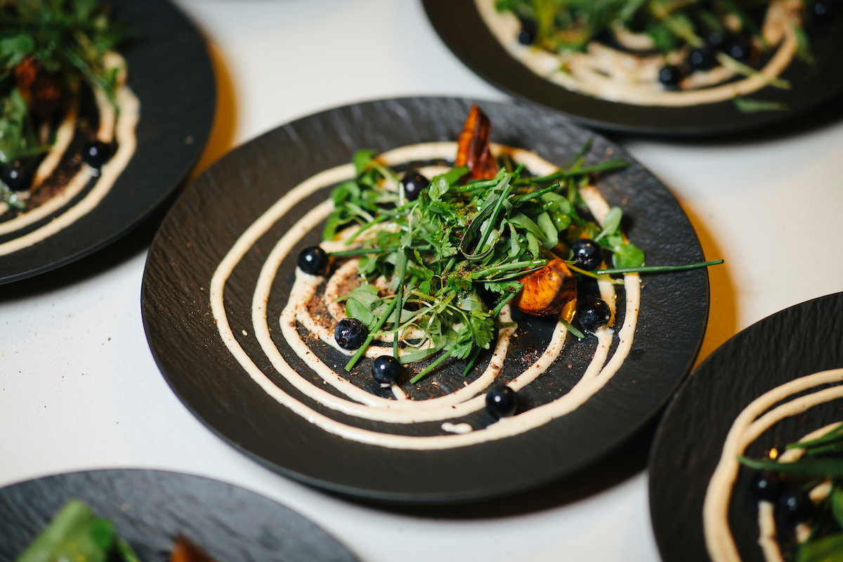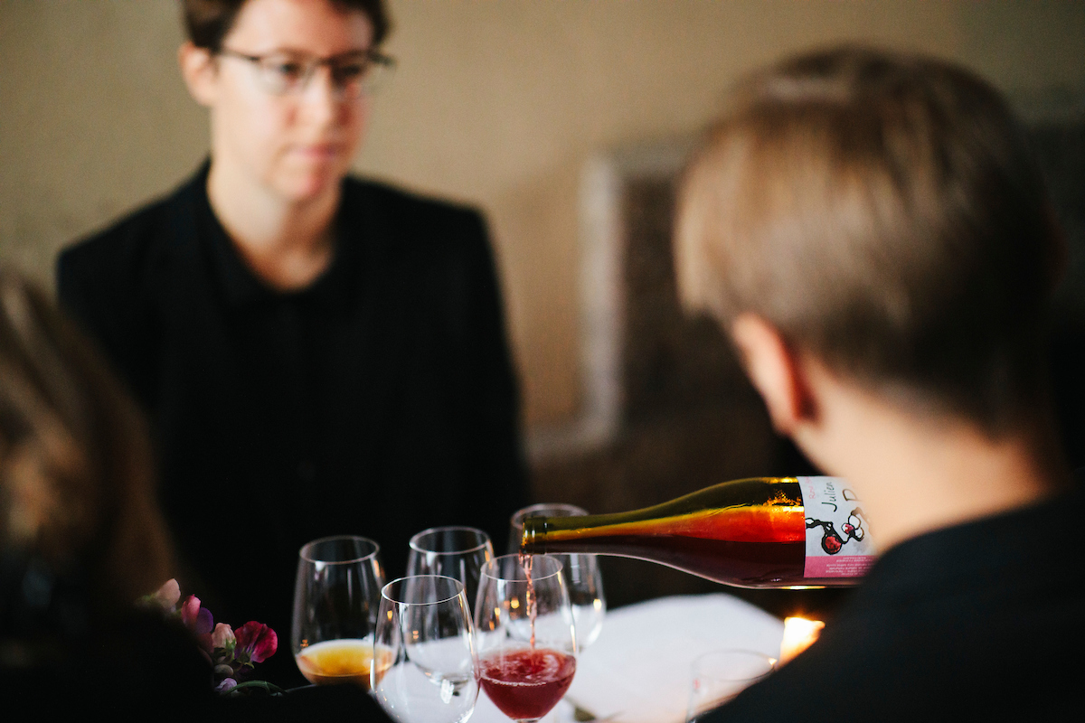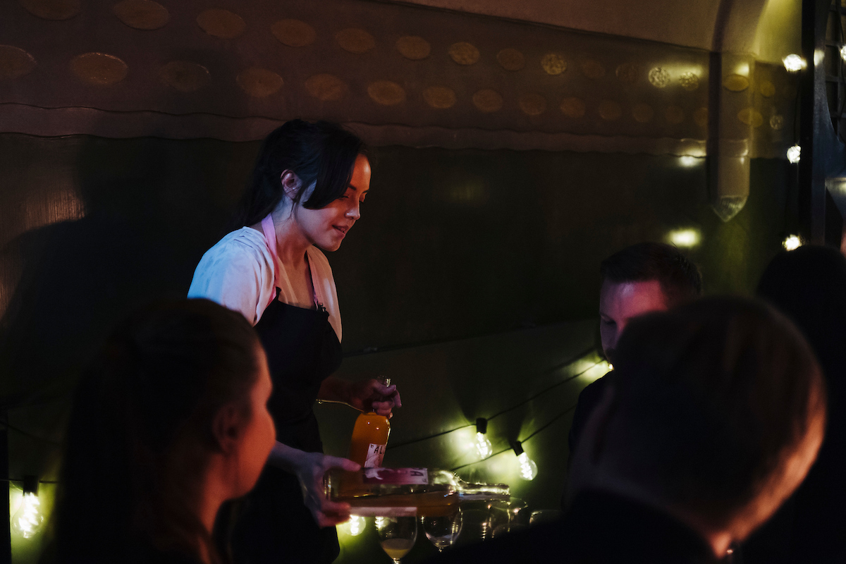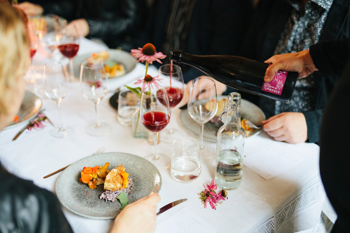 Love Harvest -illallisen viineistä vastasi natuviineihin erikoistunut Let me Wine, jonka perustaja ja sommelieeri Toni Feri oli koko illan paikan päällä kertomassa kunkin juoman luonteesta ja brändien taustoista. Ihmisiä kiinnosti yllättävän paljon illan juomakattaus, joka näkyi myös holittomien juomien myynnissä. Alma oli valmistanut jokaiselle annokselle alkoholittoman vaihtoehdon ja ne olivat aivan hitti! Meiltä on kyselty niitä jälkikäteenkin — palaamme asiaan. 😉