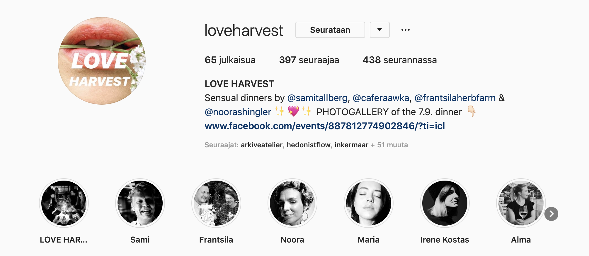 Tällaisia elämyksiä ei kukaan luo yksin ja tiimityö on kaikki kaikessa. Kiitos Sami Tallberg, Frantsila ja Café Raawkan Maria Lundström, sekä remmiin vauhdissa loikannut Alma Aurora Kallio hienosta projektista, jonka myötä saimme kasvien terveysvaikutuksia esille ihan uudella tavalla. Illasta tuli ikimuistoinen monella tapaa, mutta päällimmäisenä on kiitollinen fiilis siitä, että niin moni laittoi meille viestiä jälkikäteen. Tämä oli tavallaan testi, jonka myötä halusimme vähän tunnustella, mitä meinaatte konseptistamme. Kaikinpuolin hyvältä vaikuttaa ja eiköhän Love Harvest ilmesty taas jossakin muodossa johonkin, kun sopiva aika koittaa. Pidän teitä ajan tasalla. Kannattaa myös ottaa seurantaan Love Harvest IG-tili, joka on pääasiallinen viestintäkanavamme.