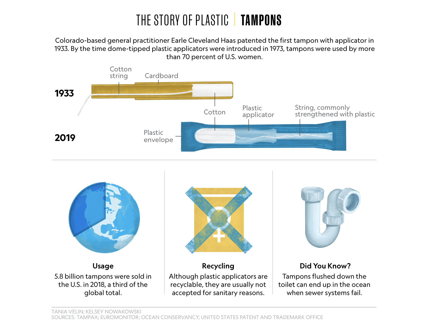 ”Getting a handle on how much plastic waste comes from menstrual products is tough, in part because it’s labeled as medical waste and does not need to be tracked, and in part because so little research has even looked at the scope of the problem. But rough estimates for the likely output are staggering: In 2018 alone, people in the U.S. bought 5.8 billion tampons, and over the course of a lifetime, a single menstruator will use somewhere between 5 and 15 thousand pads and tampons, the vast majority of which will wind up in landfills as plastic waste.”