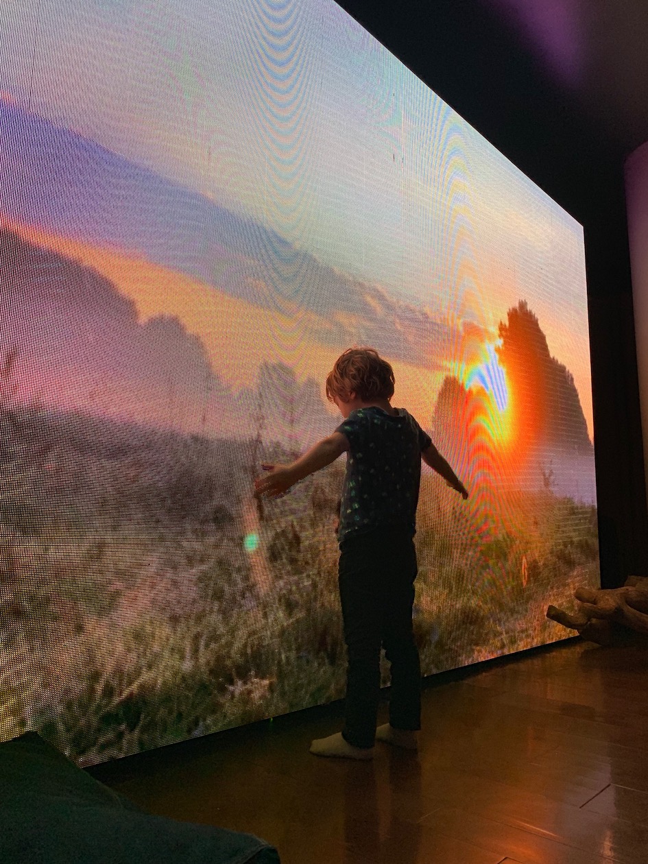 Seuraavaksi huomio kiinnittyy neuletuotteisiin, pellavaan, luonnonkosmetiikkaan ja keramiikkaan, mutta aloitetaan silti liiketilan perältä: koko seinän kokoinen valkokangas näyttää videokuvaa suomalaisesta luonnosta. Lapseni huokailivat tykkylumimetsän äärellä ja melkein itketti tajuta, että lähemmäs lunta he tänä talvena tuskin pääsevät. Välillä valkokankaalla liehuivat revontulet ja seuraavassa hetkessä kuvaan lampsi karhu. Ja taas se äänimaisema — arvostan!