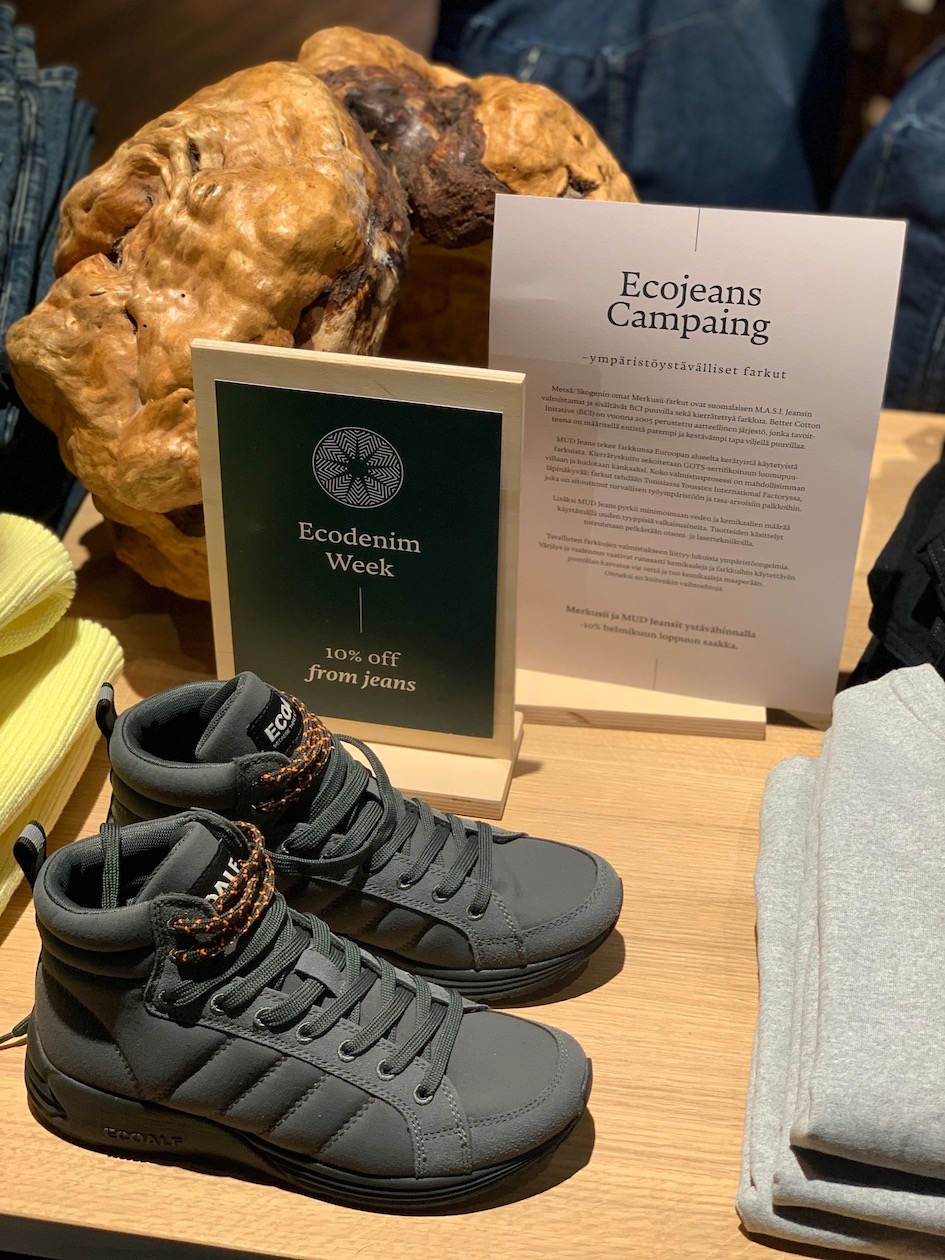 Metsä Skogenissa pääroolissa on kuitenkin ekologinen ja eettinen design. Liikkeestä löytää kaikkea neuleista collareihin, joogavaatteista toppatakkeihin ja farkuista lenkkareihin. Lisäksi myynnissä on pellavatuotteita, lakanoita, astioita ja luonnonkosmetiikkaa– jonka muuten on valmistanut ihana Hetkinen-kosmetiikka (kirjoitin teille brändistä viime talvena). Hetkinen on luonut Metsä Skogenille omat metsä-luonnonkosmetiikkatuotteet, jotka kaikki on pakattu lasiin. Muovia ei Metsä Skogenista löydy. Oma suosikkituotteeni on koivu-jalkakylpy, jonka ostin syksyn avajaisissa. Sen tuoksu on mieletön ja lisäksi jaloista tulee pehmeät ja samettiset. Olen hankkinut tätä lahjaksi ystäville jo pariin otteeseen.