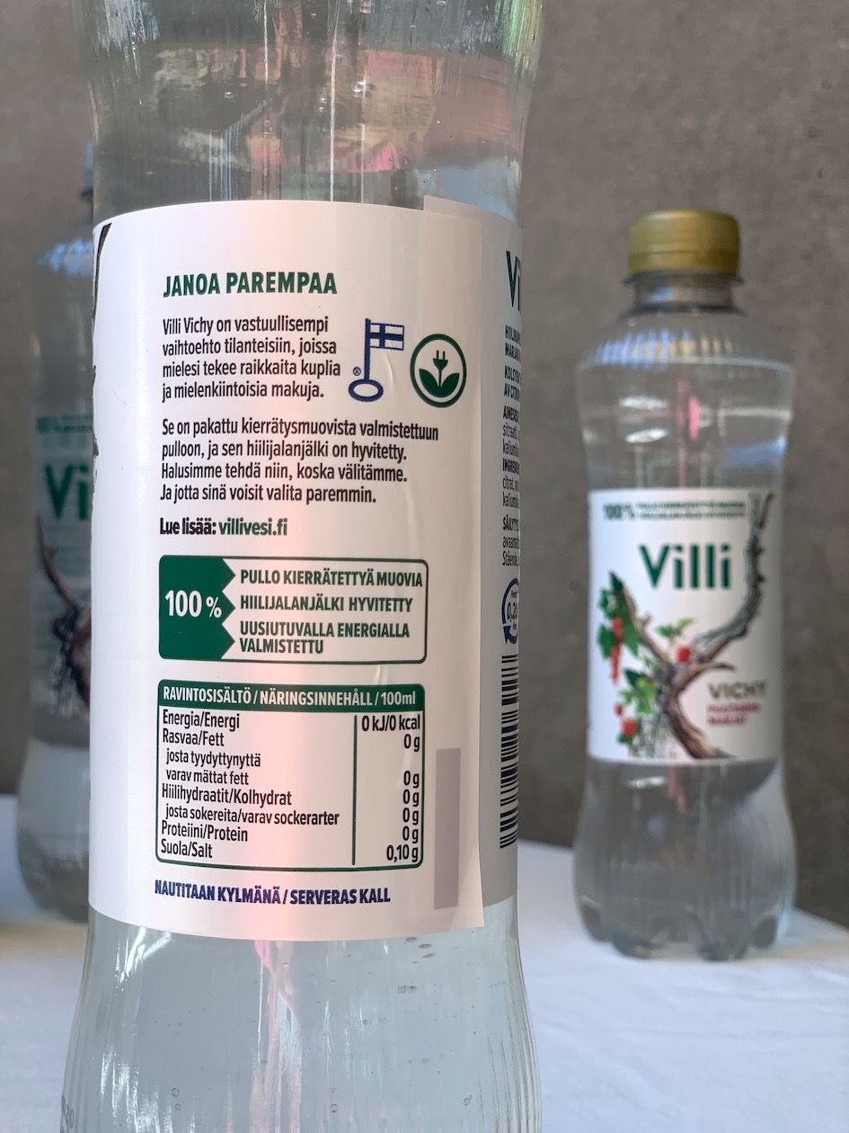 Kierrätys meillä toimii jo ja pullopantti-systeemiämme ihastellaan ympäri maailmaa.  Pelkkä vesipullojen kierrätys ei kuitenkaan ympäristöä pelasta. Se että kuluttajat kierrättävät pullonsa ei tarkoita sitä, että yritykset oletusarvoisesti käyttäisivät vanhoja pulloja uusien materiaaleina. Jotkut yritykset kuitenkin käyttävät 100% kierrätettyä muovia ja mm. Finn Springin uusi Villi-sarja on paitsi 100% kierrätysmuovista valmistettu, sen hiilijalanjälki on myös 100 % hyvitetty. Kokonaan kierrätysmuovista valmistetun Villi-pullon hiilijalanjäljen arvioidaan olevan noin 30 % neitseellisen pullon hiilijalanjäljestä. Kun suurin osa muovipulloista on yhä neitseellistä muovia ja yhden vesipullon valmistamiseen kuluu kolminkertainen määrä vettä, kuin mitä pullon sisälle laitetaan, ei ole vaikea valita uuden ja kierrätysmuovipullon väliltä.