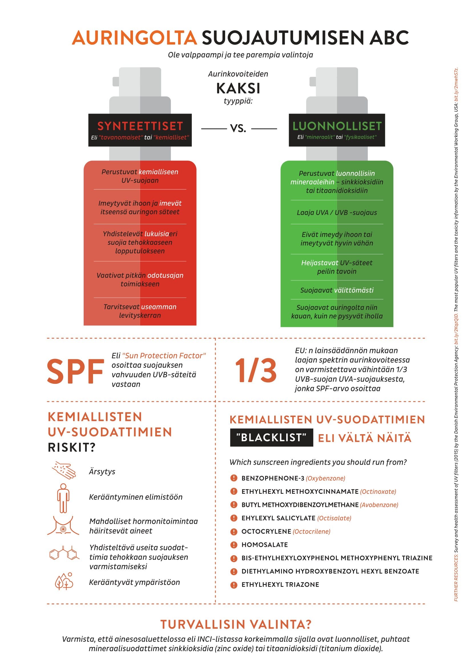 Mikäli tarvitset vähän kertausta, on oheinen infografiikka aika hyvä! Se havainnollistaa tilanteen perinteisten synteettisten (eli kemiallisten) ja luonnonkosmetiikan (eli fysikaalisten) suojien välillä: