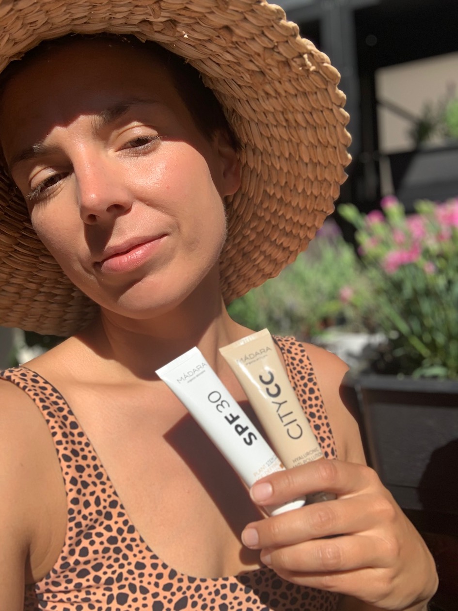 Kasvoille käytän itse päivästä ja tarpeesta vaihdellen joko SPF 30 -voidetta tai City CC -Cream -voidetta (SPF 15), kuvassa oikealla kasvoillani on City CC -voide sävyssä Light. Molemmat tuotteet antavat kasvoille sävyä, eikä kesällä tunnu, että näiden lisäksi tarvitsee mitään muuta meikkiä kuin ripauksen aurinkopuuteria. Mieletöntä, että luonnonkosmetiikan parista löytyy tällaisia aurinkotuotteita!