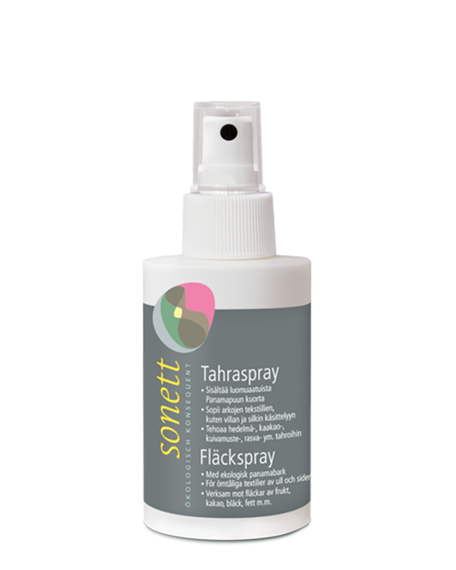 Sonettilla on myös vegaaninen tahratuote, mikäli sappi ajatuksena tuntuu ikävältä. Tahraspray on kätevän kokoinen, pieni suihkepullo, joka niinikään on helppo ottaa mukaan reissuun (kuvassa).