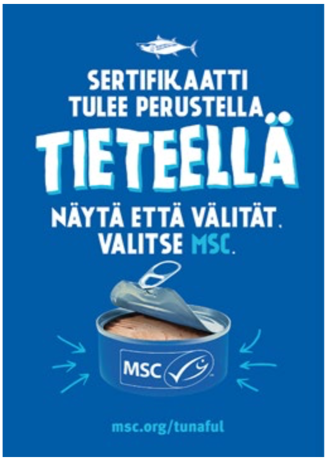 Jos haluaa päästä helpolla, senkus tuijottaa ruokakaupassa merkkiä: MSC-sertifikaatti takaa, että kalan pyynti on kestävää. MSC on ainoa mereneläviä koskeva sertifikaatti, joka on YK:n tunnustama. Kaupassa kannattaa olla tarkkana, sillä erilaisia sertifikaatteja ja mainoslauseita on joka lähtöön. Kalatuote-sertifikaateista jos puhutaan: esimerkiksi Friends of the Sea -sertifikaatti ei ole kolmannen osapuolen valvoma ja Dolphin Safe -merkki puolestaan takaa lähinnä sen, ettei delfiinejä ole vahingoitettu kalastusprosessissa.