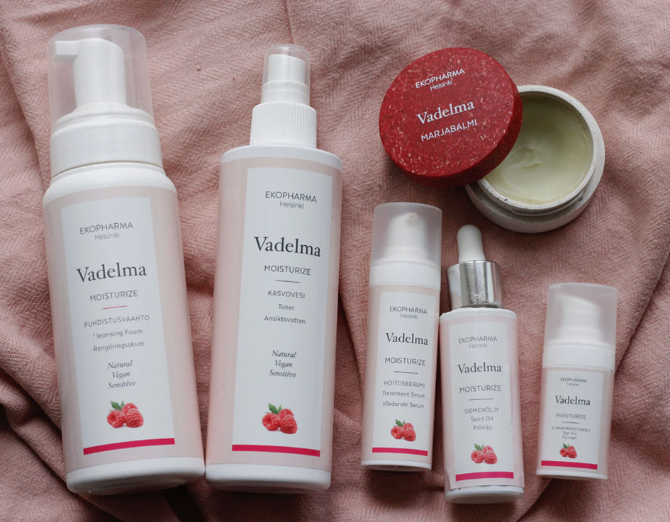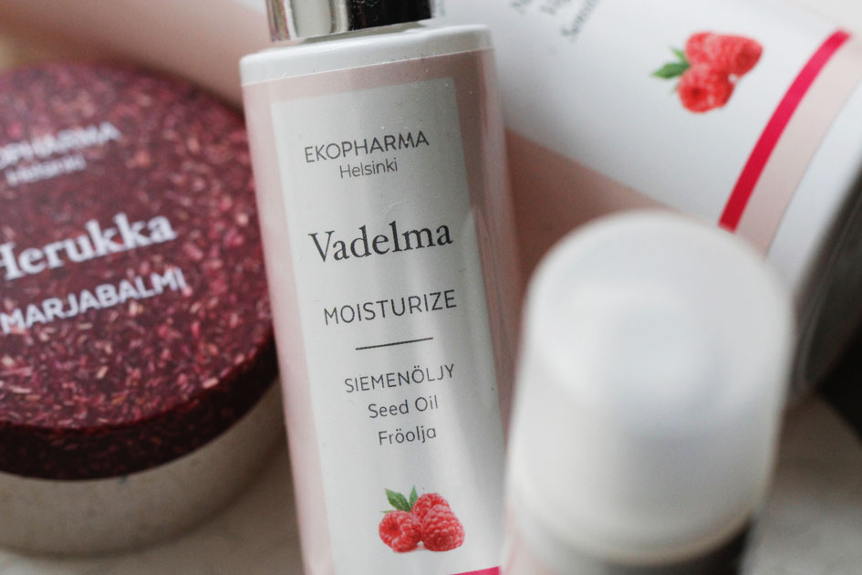 Ekopharman FI-Natura -sertifioitu ja vegaaninen Vadelma-sarja sisältää 9 tuotetta, joista testasin kuutta (balmin lisäksi). Puhdistusvaahto, kasvovesi, hoitoseerumi, siemenöljy, kosteusvoide ja silmänympärysgeeli olivat kaikki huippuja! Iho oli loistavassa kunnossa koko testiajan ja siemenöljyn käyttöä jatkoin, kunnes se loppui. Se on aina hyvä merkki. Mulla on jonossa niin iso määrä tuotteita, että kivatkin tuotteet on pakko laittaa sivuun uusien tieltä, käytössä kun on vaan tämä yksi naama, eikä siihen oikein mahdu montaa merkkiä ja tuotetta kerralla.