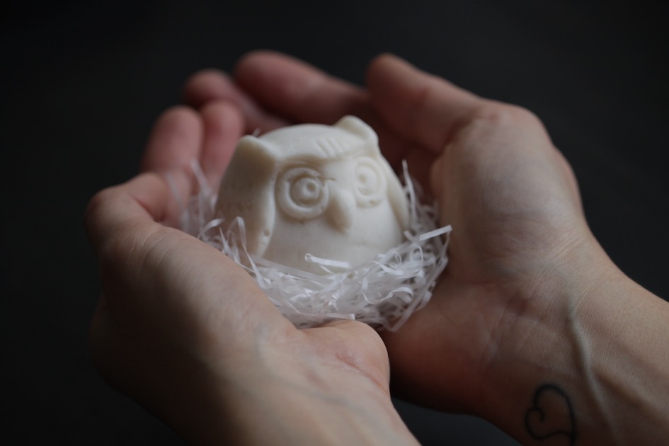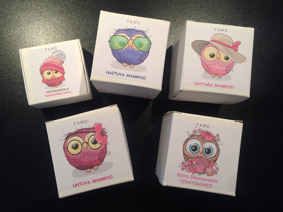 Famo valmistaa Suomessa sekä näitä ihania pöllön näköisiä että ihan perinteisiä, kulmikkaita shamppoopaloja sekä hoitoaineita myös. Itse asiassa Famon perustaja Johanna Merilinna oli Suomen ensimmäinen hoitoainepalojen valmistaja ja nyt nämä muottiin tehdyt pöllöt ovat niinikään Suomen ekoja vastaavia. Pioneerimimmi!