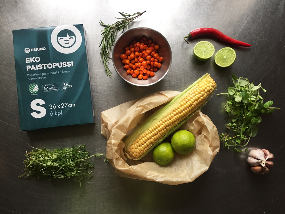 Rakastan tuoretta maissia ja hain ne kaupasta, mutta maustoimme ne hävikkiraaka-aineilla. Maissihan on parhaimmillaan höyrytettynä, mutta siten kun sen valmistaa, ei mukaan saa juuri muita makuja — paitsi jos höyryttää maissin mausteineen pussissa! Maissista tulee yhtä mehevä ja herkullinen kuin höyryttämällä, mutta siihen ihania, uusia makuja paperisen pussin uumenissa. Käytimme postauksessa ESKIMOn ekopaistopussia, joita arvomme Viikon arvassakin (lisää jutun lopussa).